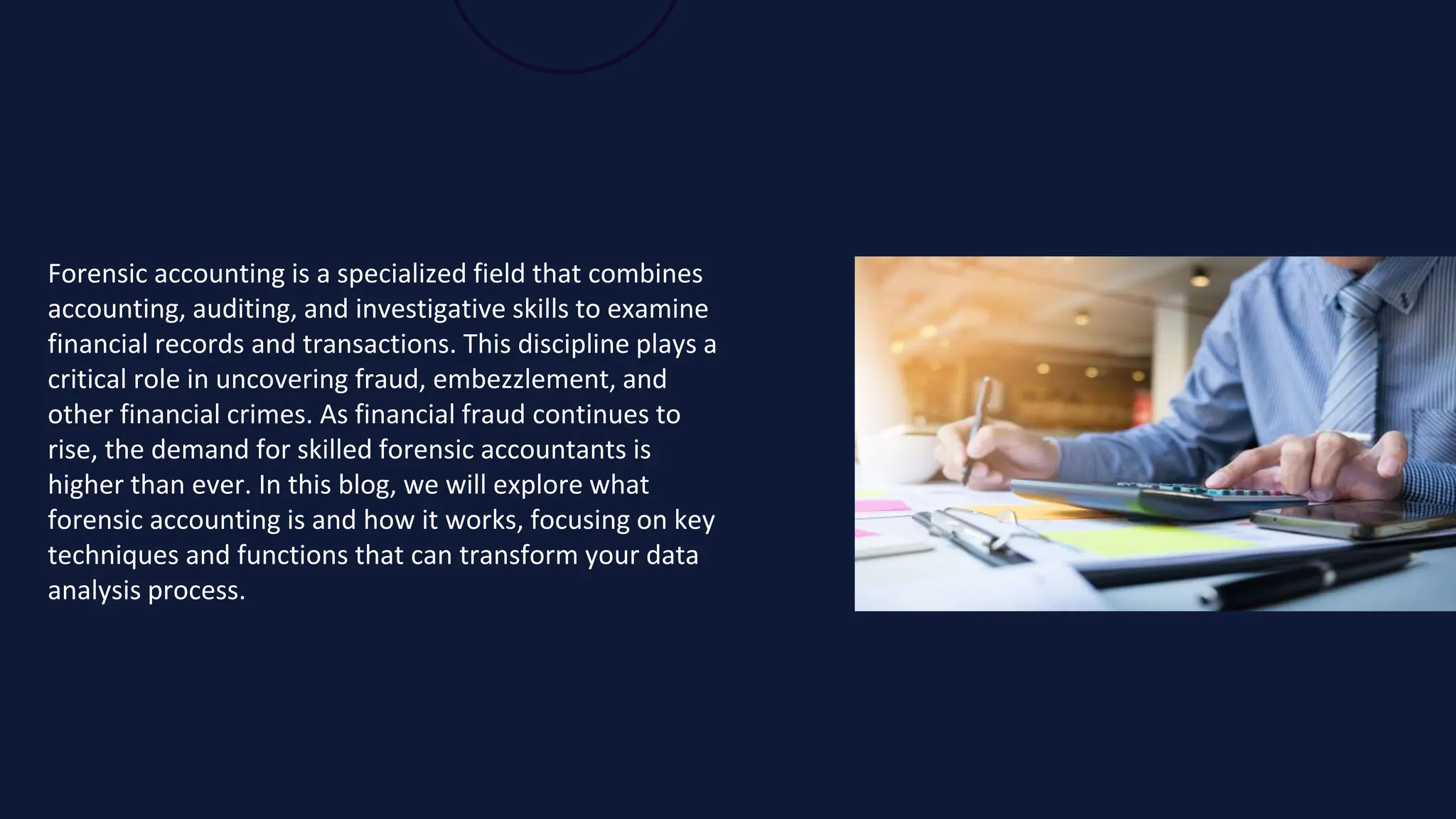 Forensic accounting is a specialized field that integrates accounting, auditing, and investigative skills to detect and prevent financial fraud and support litigation. The process involves steps such as data collection, analysis, and reporting, and is applied in various scenarios including fraud detection, insurance claims, and corporate investigations. With the increasing use of data analytics and the demand for forensic services, acquiring certification in forensic accounting is beneficial for career advancement and professional recognition.