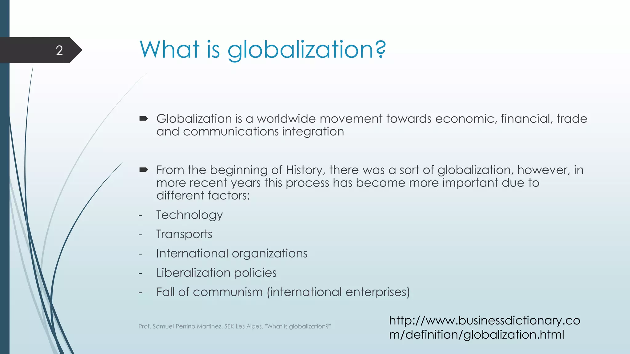 Globalization refers to the increasing integration and interdependence of world economies, technologies, and cultures. While a form of globalization has existed throughout history, the current period began accelerating in the late 20th century due to several factors: advances in technology and transportation that facilitated the rapid movement of capital, goods, and information across borders; the growth of international organizations that promoted cooperation between countries; liberalization policies that reduced restrictions on trade; and the fall of communism which allowed formerly closed economies to enter the global marketplace.