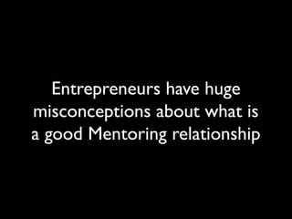 The document discusses misconceptions about mentoring, clarifying that a good mentor does not provide constant emotional support like a therapist or a friend. Instead, a good mentor offers valuable industry knowledge, pushes for self-sufficiency, and prioritizes the mentee's best interests without being overly available. It emphasizes the need for realistic expectations in a mentoring relationship.