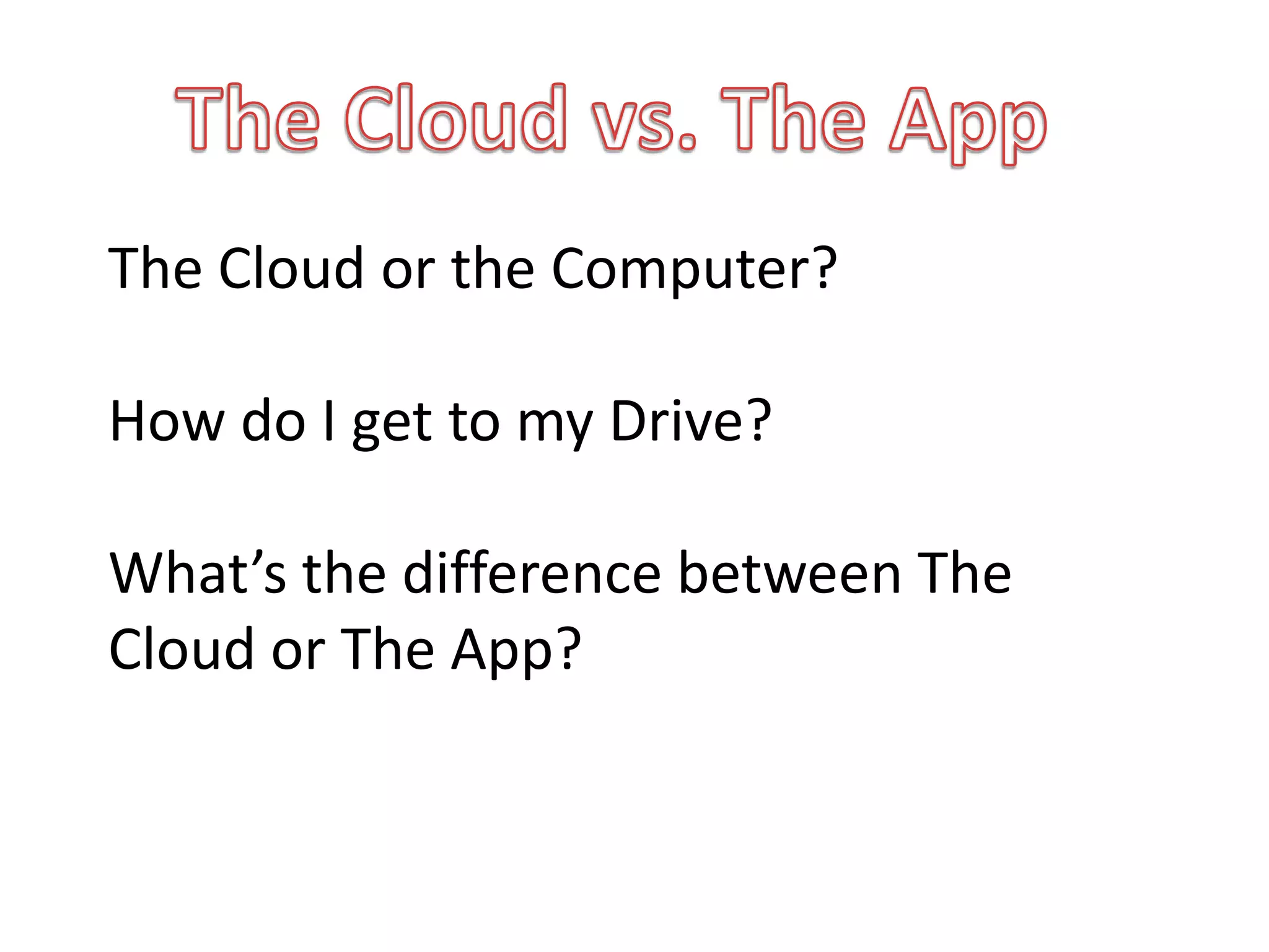 The document explains Google Drive, highlighting how it functions as both a cloud service and a local application. It covers topics such as uploading files, file format conversion, storage quotas, and various settings related to sharing and organizing documents. Additionally, it clarifies the distinction between 'My Drive', 'Shared with Me', and other organizational features.