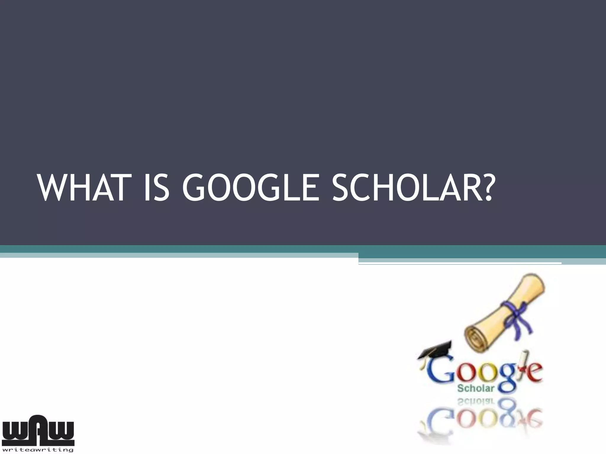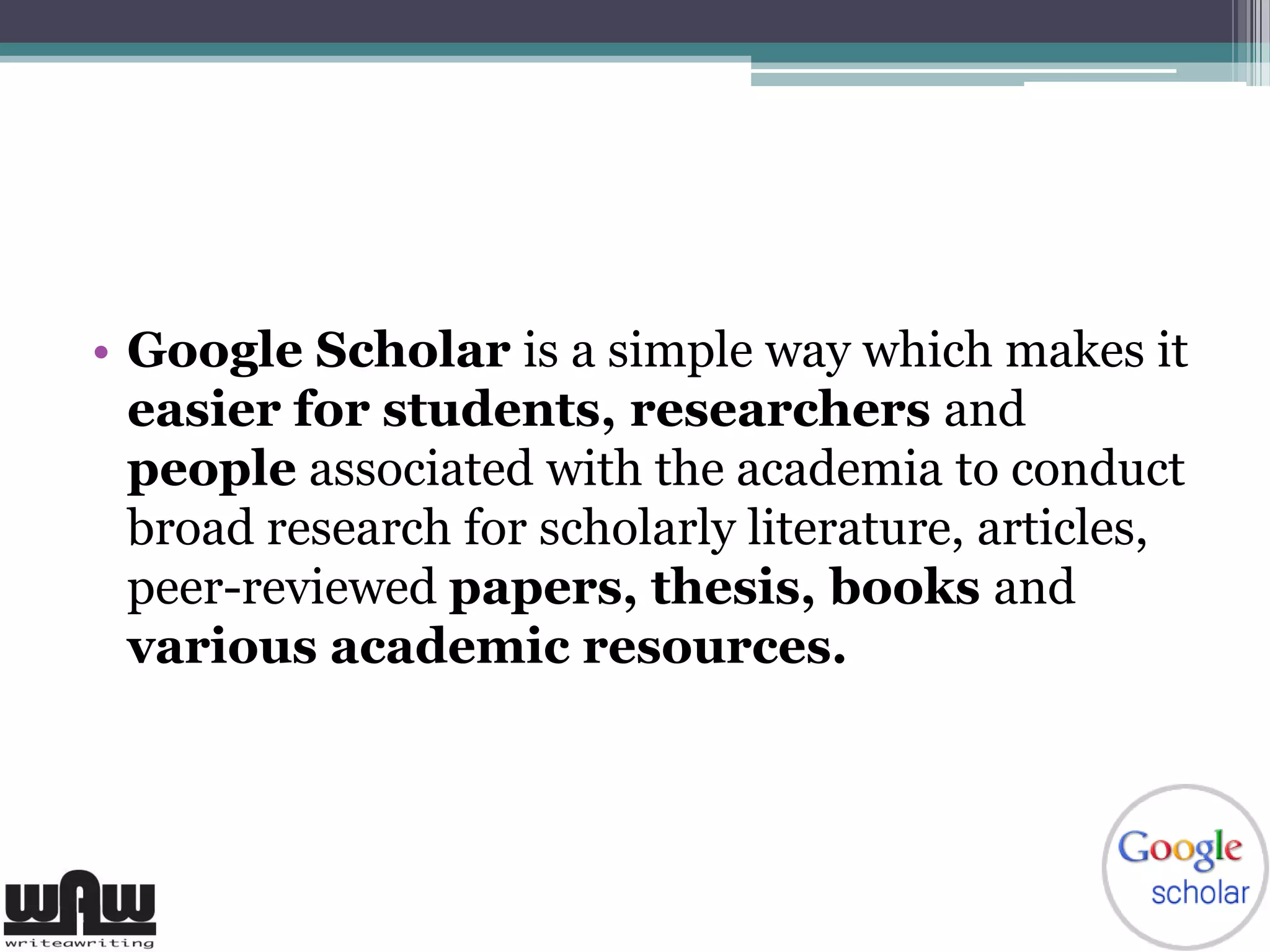 Google Scholar is a search engine created by Google in 2004 to allow students, researchers, and academics to easily search scholarly literature such as peer-reviewed papers, theses, books, and articles. It indexes millions of publications from university and private libraries that have partnered with Google Scholar. While it provides abstracts and citations for free, full texts often require a paid subscription. Advanced search features allow filtering results by date, author, publication, subject area, and more operators to refine searches. However, as a beta product, Google Scholar's database is still developing despite making academic research more convenient.