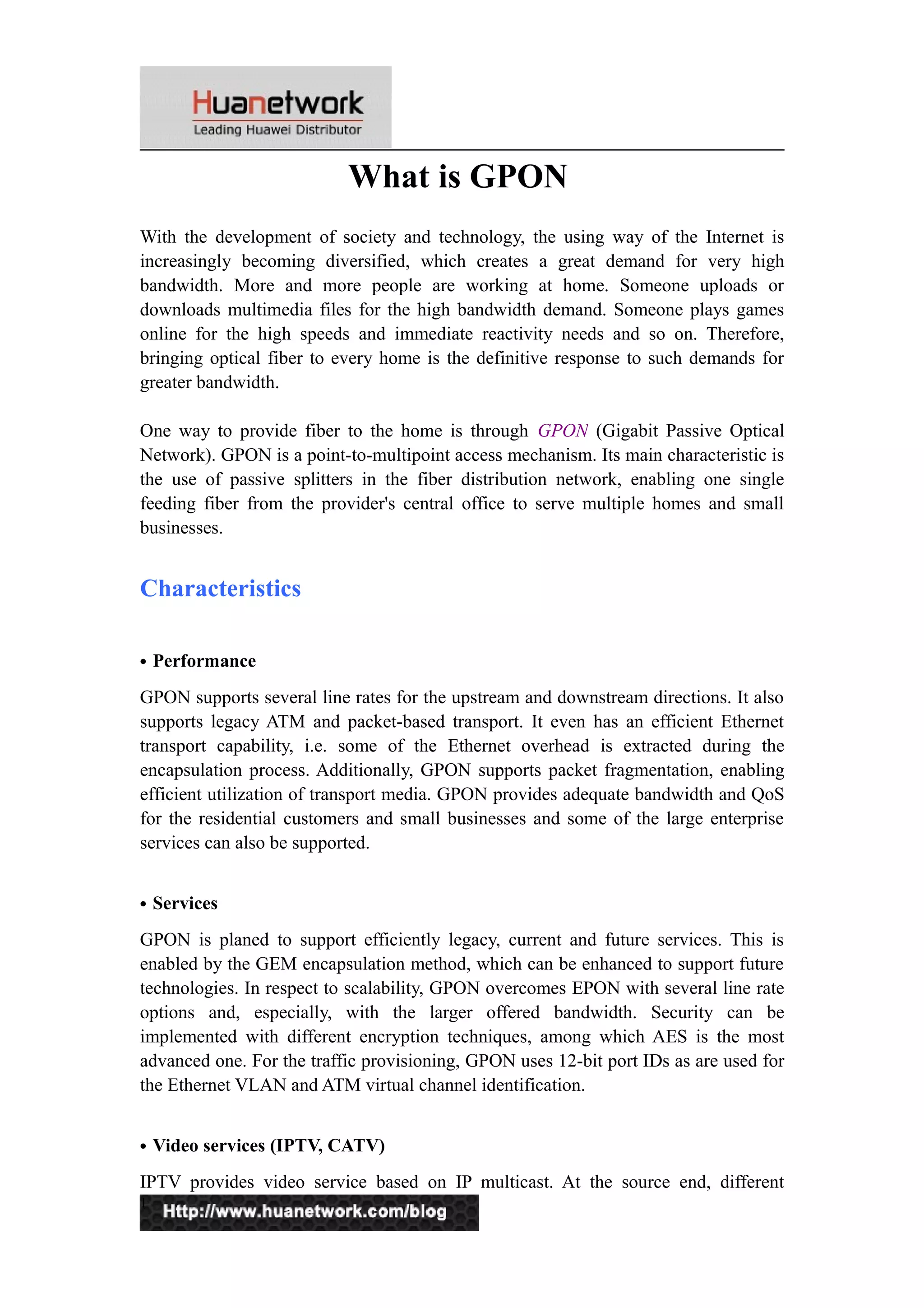 GPON (Gigabit Passive Optical Network) is a fiber optic technology that brings optical fiber closer to homes and businesses to deliver high bandwidth internet access. It uses a point-to-multipoint architecture with passive splitters to deliver fiber connectivity in a cost-effective manner. GPON supports high speeds, legacy services, and new services like IPTV through efficient encapsulation methods. It consists of an optical line terminal at the provider and multiple optical network terminals connected through a passive optical distribution network.