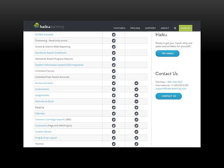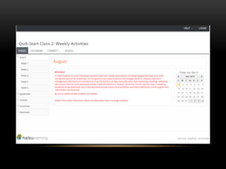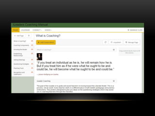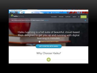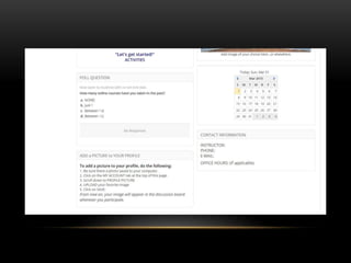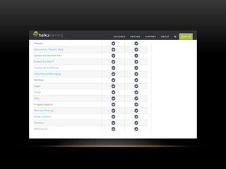 An LMS (learning management system) is a software application that uses web-based technology to plan, implement, and assess learning. It allows for flexible organization of course content like assignments, resources, activities, and assessments. An LMS is designed specifically for education and accommodating different learning styles and environments, unlike a basic webpage. Popular LMS platforms include Blackboard, Edmodo, and Moodle, and an LMS can support various page types like course introductions, content, projects, and communities.