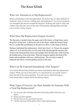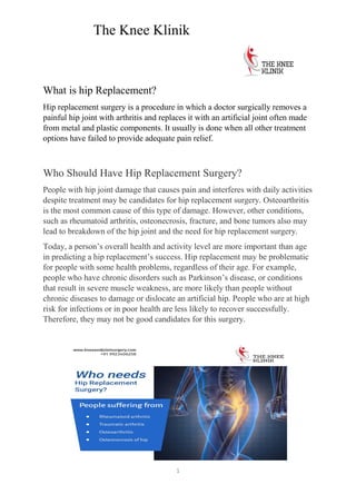 Hip replacement surgery involves surgically removing the damaged hip joint and replacing it with an artificial joint made of metal and plastic components. It is usually an option after other treatments have failed to provide relief from pain caused by conditions like osteoarthritis or rheumatoid arthritis. While age is less of a factor now, overall health and ability to recover are important considerations for whether someone is a good candidate for replacement surgery. The procedure takes 1-2 hours and involves removing diseased bone and cartilage and replacing it with artificial femoral head and acetabulum components. Limited movement is allowed after surgery, and exercises like clam shells help strengthen muscles while avoiding twisting or back strain during recovery.