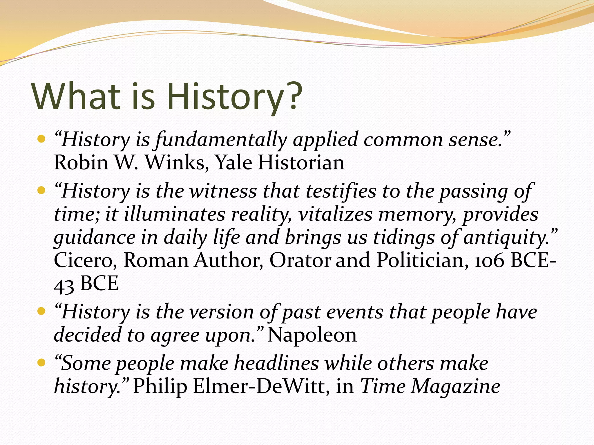 This document discusses the study of history and provides definitions of key concepts. It can be summarized as: