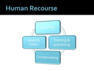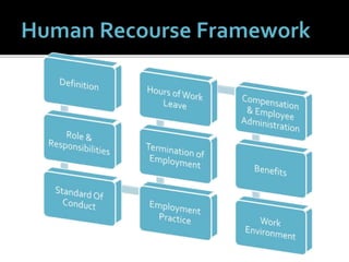 The document outlines the key aspects of human resources management for an organization, including functions of management and staff, standards of conduct, employment practices, compensation and benefits, and ensuring a safe and healthy work environment. It discusses topics like hiring and termination procedures, hours and leave, pay administration, and creating an environment free of discrimination.