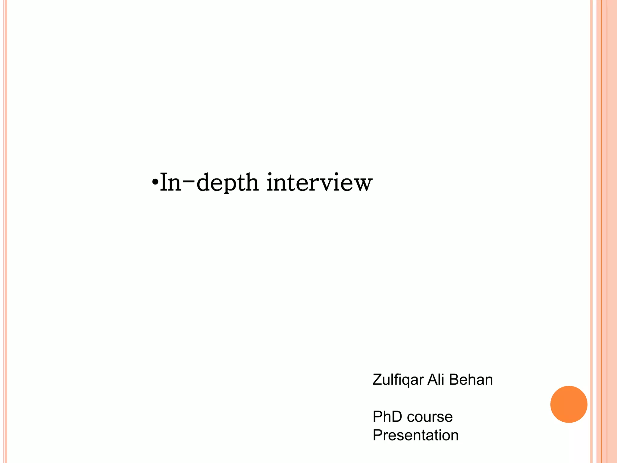 The document discusses in-depth interviews as a method for qualitative data collection in research. It provides definitions of in-depth interviews and notes that they involve one-on-one, unstructured or semi-structured conversations to allow participants to freely discuss their experiences and perspectives on a topic. The summary describes how in-depth interviews can be useful for obtaining detailed first-person accounts and exploring topics in depth, but require skill from interviewers in actively listening, asking probing questions and guiding the discussion.