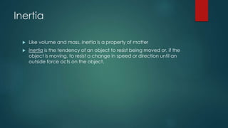 Inertia is a property of matter that resists changes in motion. It is the tendency of an object to remain at rest or remain in uniform motion in a straight line unless acted upon by an external force. Mass is the measure of an object's inertia, with more massive objects having greater inertia and therefore being harder to accelerate or change the motion of than less massive objects.