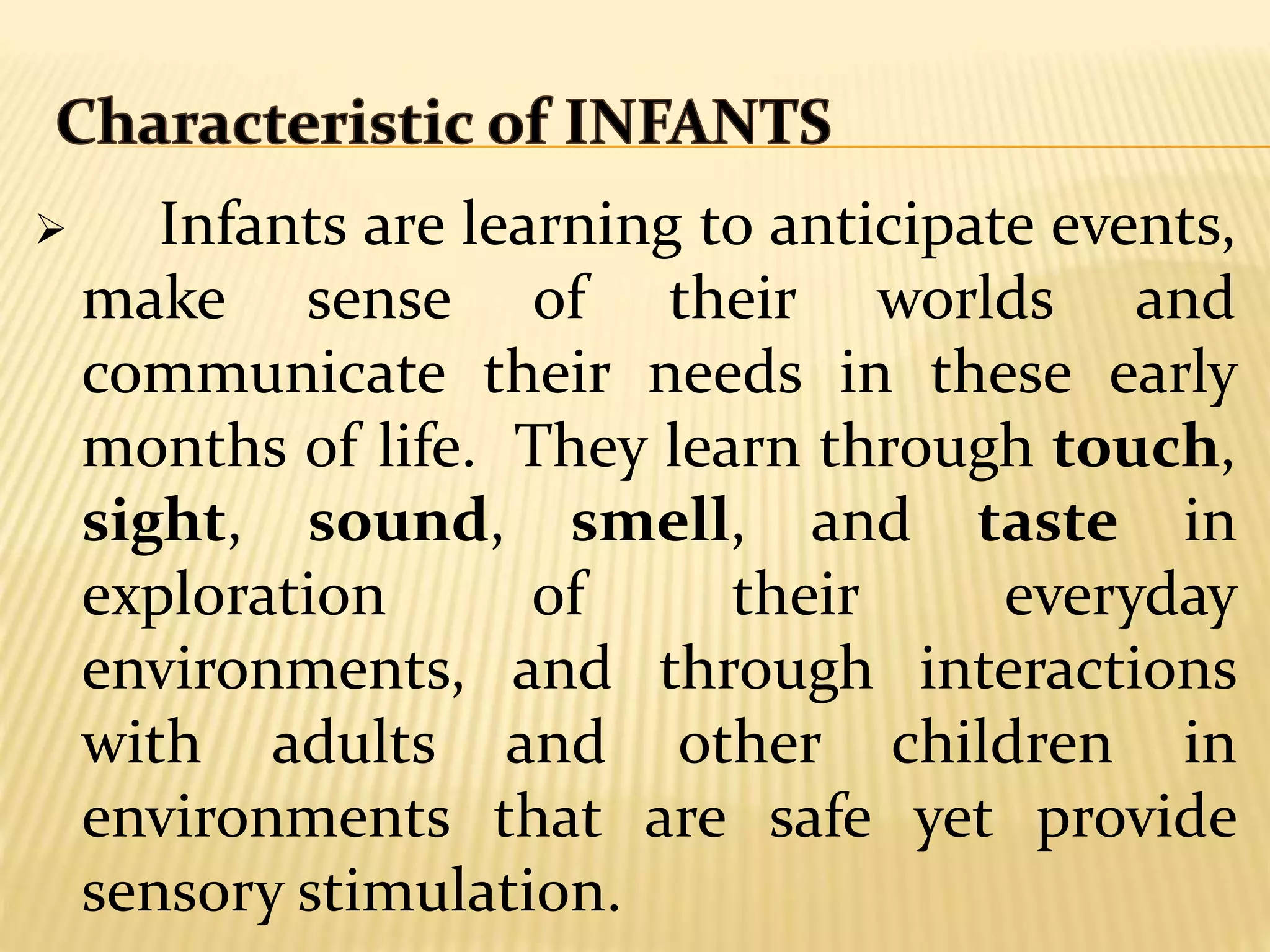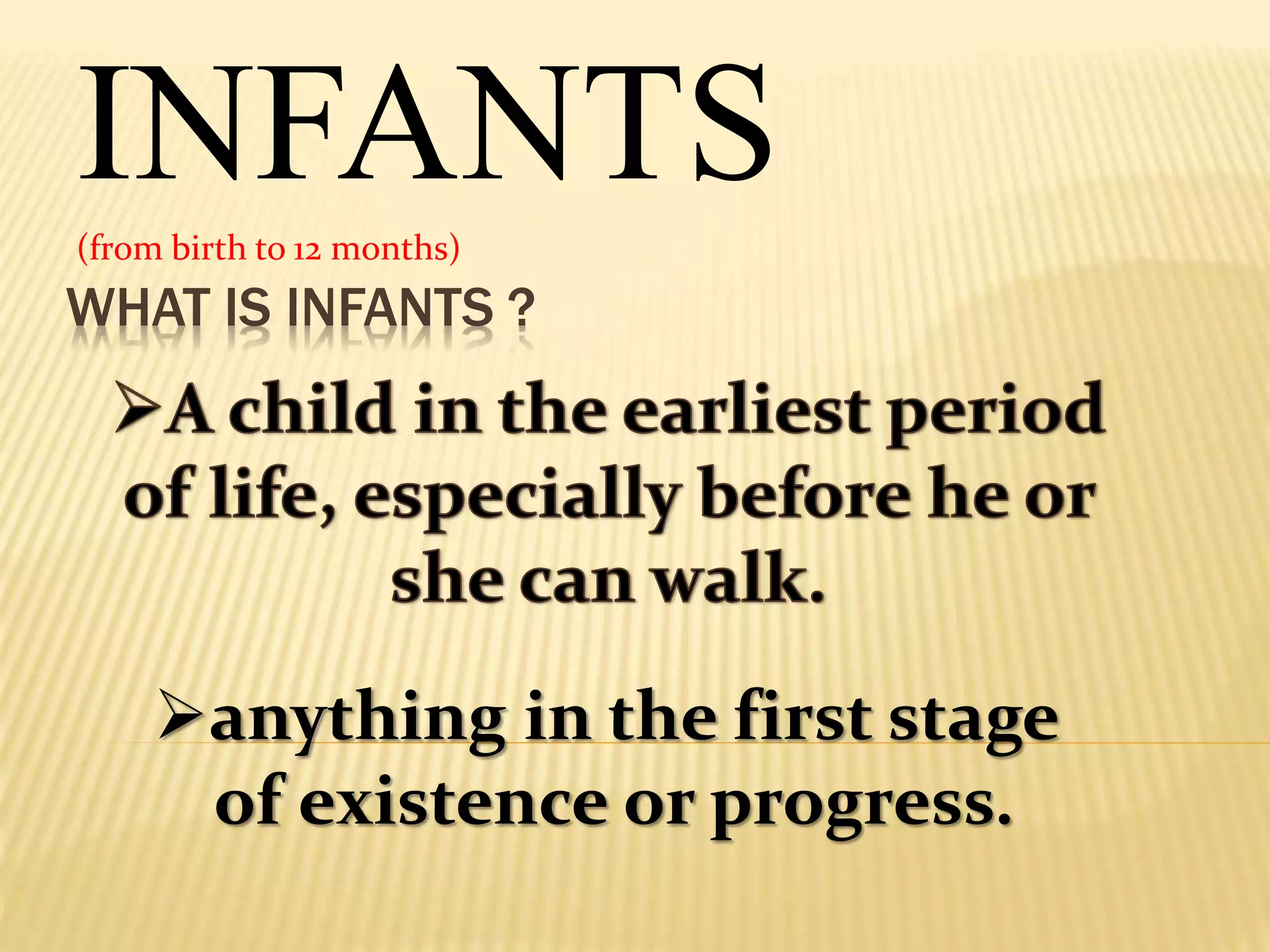 Infants are defined as children from birth to 12 months old. During this time, infants are learning about their world through their senses and interactions. Their movements start as reflexes but develop into purposeful activities like grasping, rolling over, and sitting with support. By one year old, most infants can sit alone, crawl, pull themselves up, walk when led, and weigh three times their birth weight. Infants need a safe environment to explore with responsive adults who recognize and meet their individual needs through consistent nurturing care, routines, play, and social interaction.