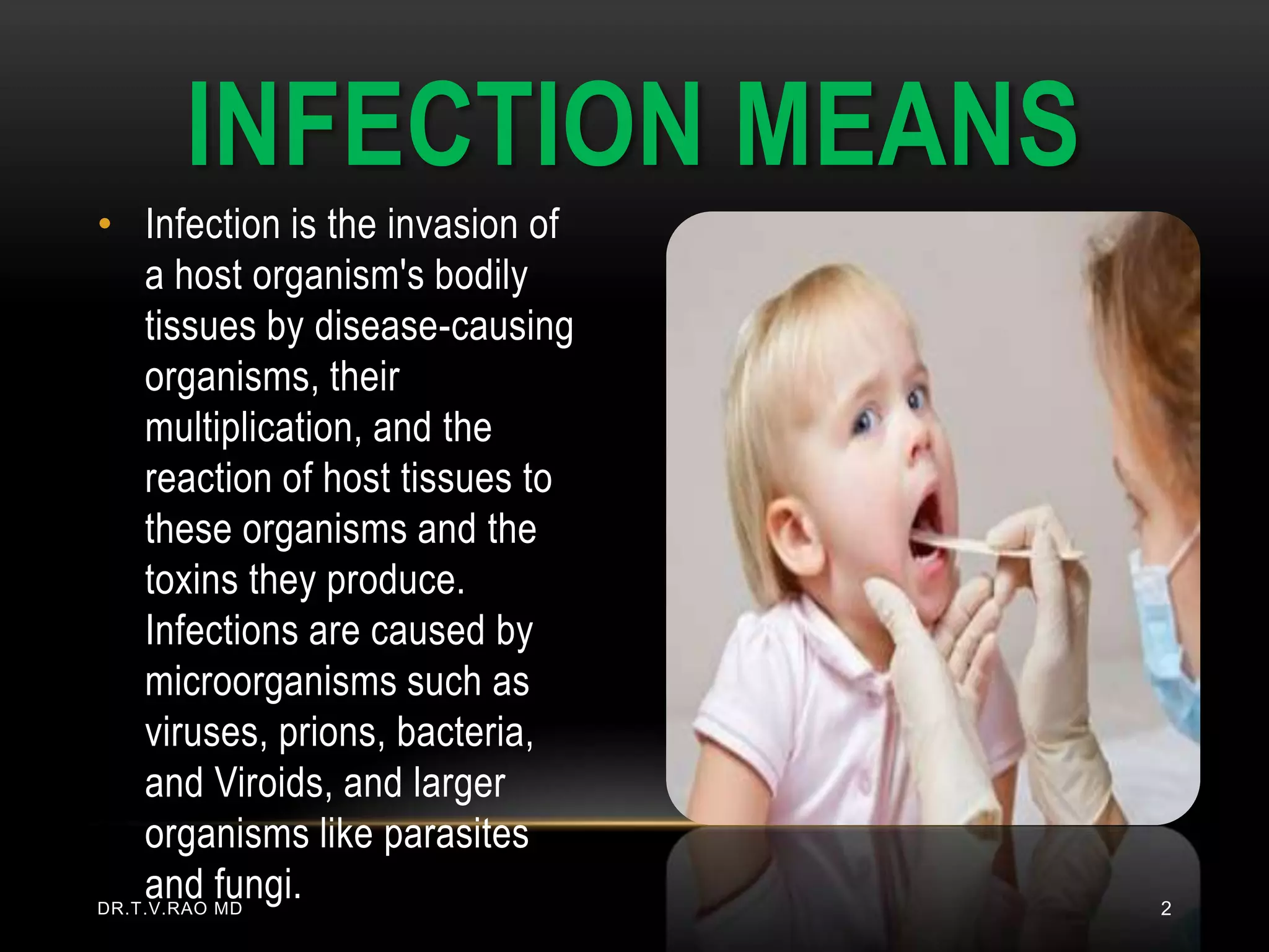 This document defines and describes various aspects of infection and infectious diseases. It begins by defining infection as the invasion of a host's tissues by disease-causing organisms and their multiplication. It then provides definitions for related terms like disease, pathogenicity, virulence, acute vs chronic infections, and more. It also describes common causative agents of human infections like bacteria, viruses, fungi and parasites. It discusses factors that influence microbial growth and how infections are spread.