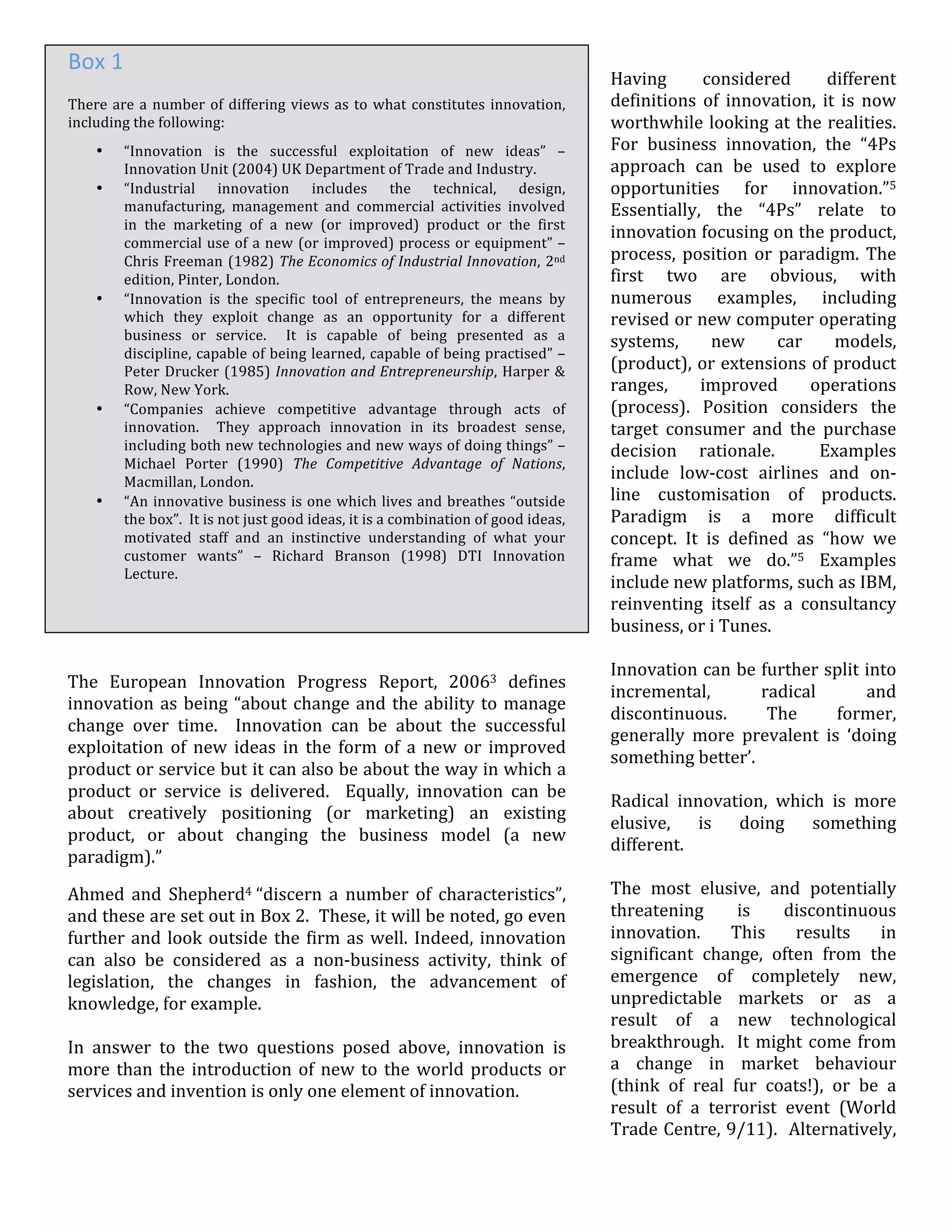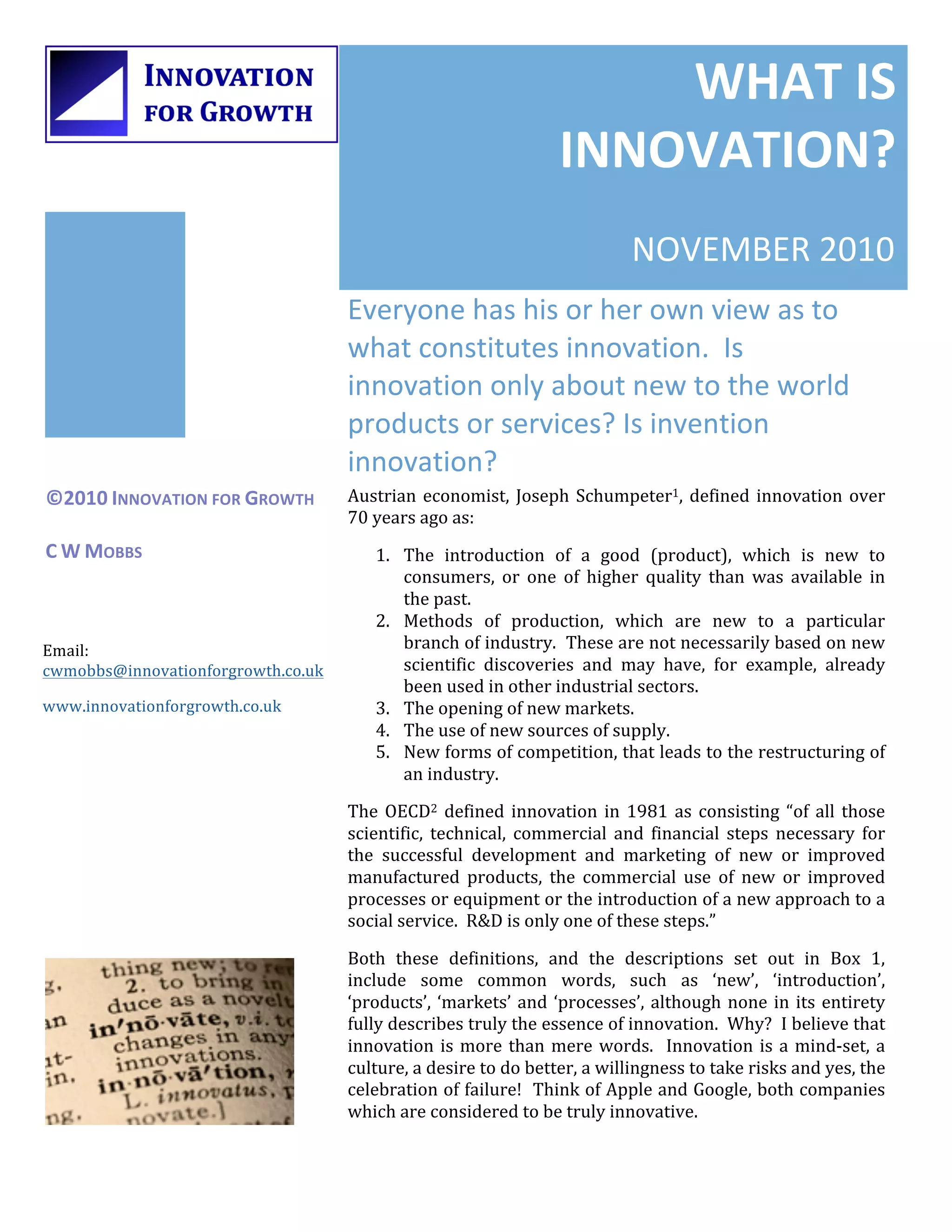 This document discusses different definitions of innovation from economists and organizations. It provides Joseph Schumpeter's definition from the 1930s that innovation includes new products, production methods, markets, supply sources, and forms of competition. The OECD's 1981 definition included scientific, technical and commercial steps for new products and processes. The document argues that innovation is more than words - it is a mindset and culture of willingness to take risks and celebrate failure. Effective innovation requires new ideas, motivated employees and understanding customer wants.