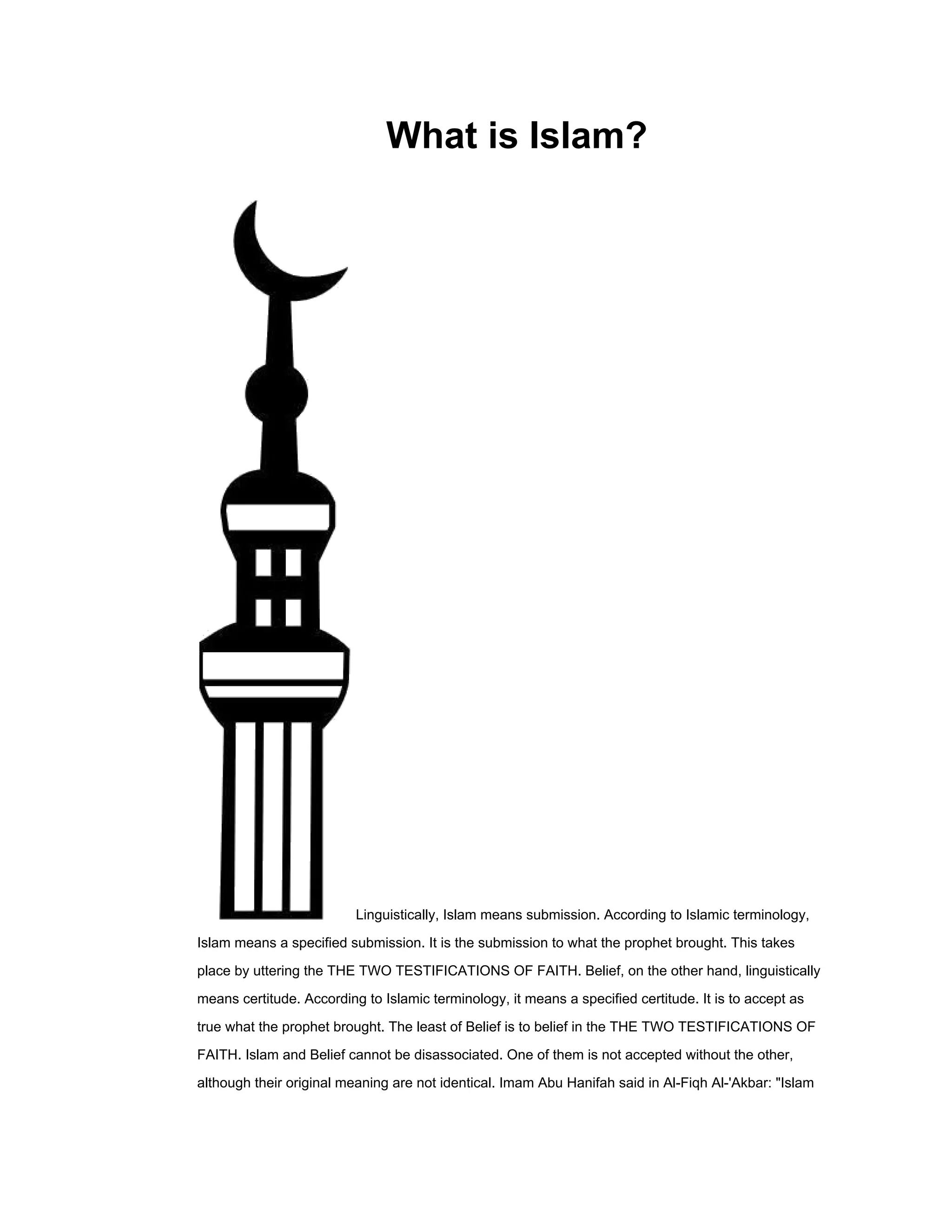 1. Islam means submission to God and what the prophet Muhammad brought, including uttering the Two Testifications of Faith that there is no God but Allah and Muhammad is his prophet.