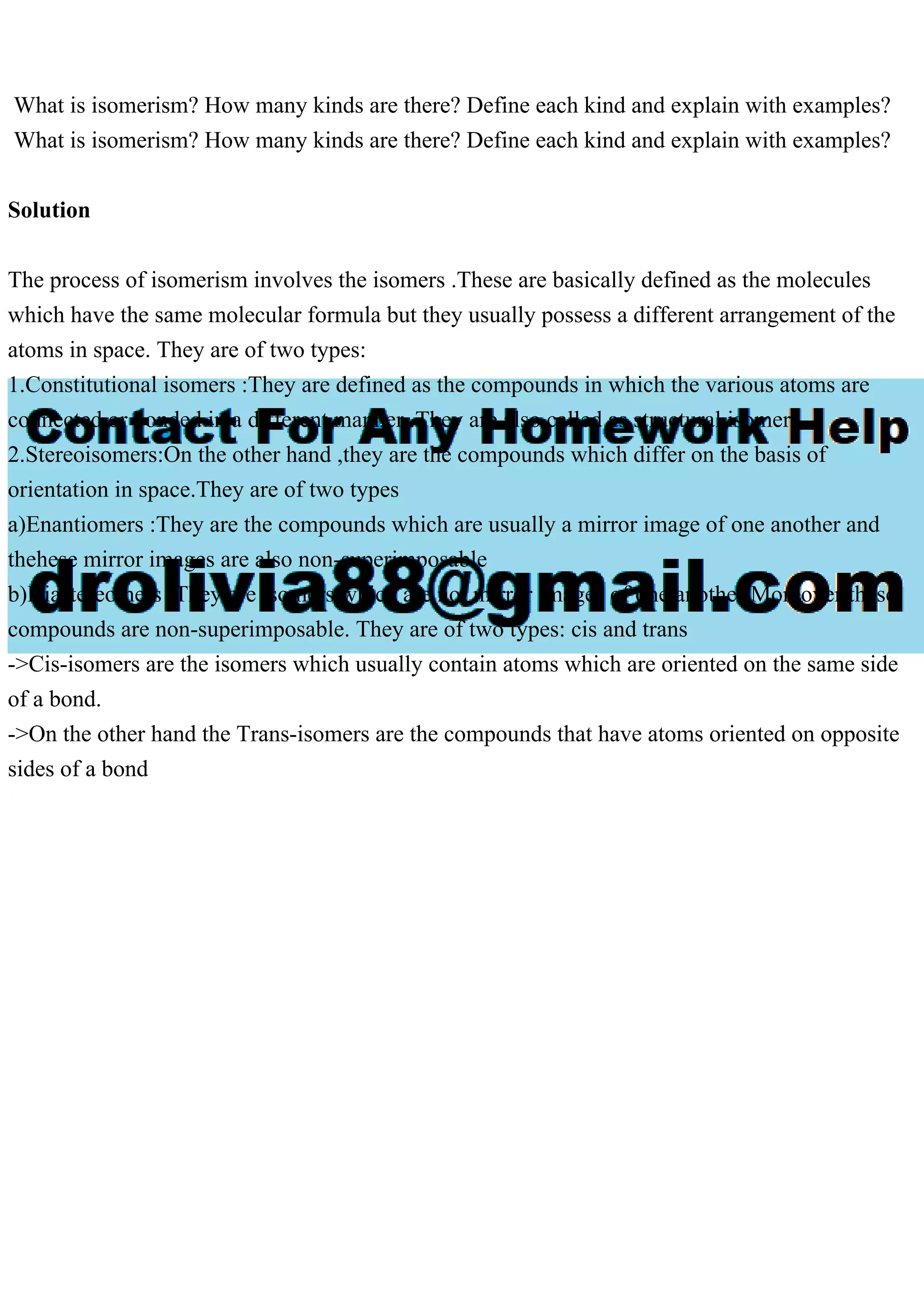 Isomerism refers to the phenomenon where molecules with the same molecular formula have different arrangements of atoms in space. There are two main types of isomerism: constitutional isomers, which differ in the connectivity of their atoms, and stereoisomers, which vary based on their spatial orientation. Stereoisomers can further be divided into enantiomers, which are non-superimposable mirror images, and diastereomers, which are not mirror images and include cis and trans configurations.