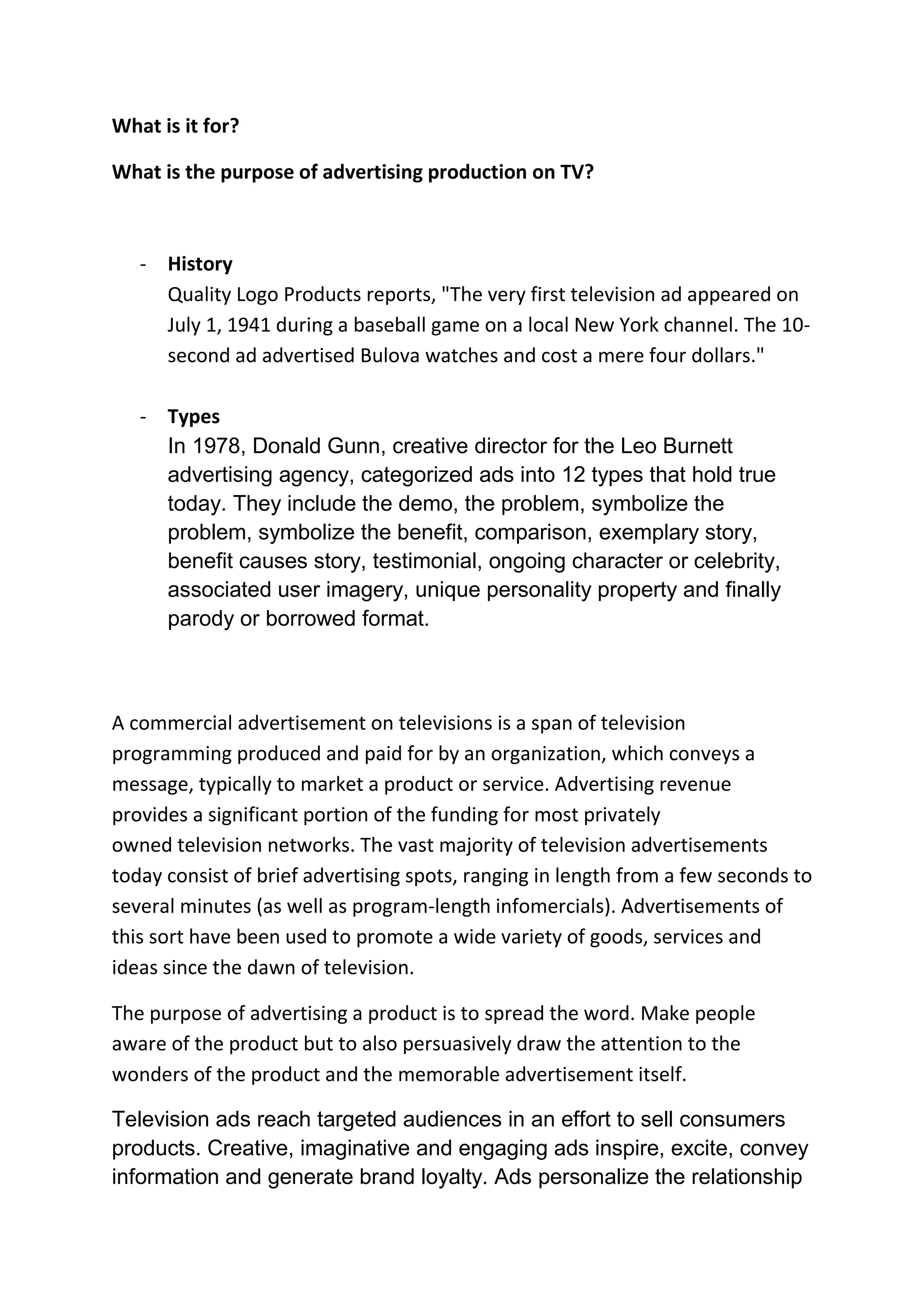Television advertisements have several purposes: to make consumers aware of products and services, to persuasively promote their benefits, and to generate brand loyalty. Ads use creative techniques like compelling narratives, memorable music, and famous celebrities to influence viewers. While brief ads of only a few seconds can promote awareness, longer commercials allow time to provide more information to help audiences remember the product. The type of music, characters, and other elements are carefully chosen to set the desired tone and appeal to targeted demographics. Popular and entertaining ads that people enjoy sharing have greater impact by increasing positive exposure through word-of-mouth and social media. Regulations in countries like the UK limit the total airtime allowed for ads per hour on commercial channels.