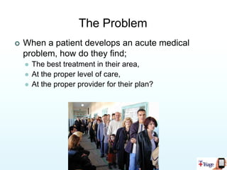 The document discusses a mobile app called iTriage that helps patients find the best treatment options for their medical issues. It was created by two ER physicians to help patients navigate the healthcare system by connecting their symptoms to the appropriate provider based on their insurance plan and level of care needed. The app aims to save health plans money by directing patients to lower-cost providers like urgent care centers instead of emergency rooms for non-emergency issues. It provides treatment options and helps patients find in-network doctors and facilities on their mobile devices.