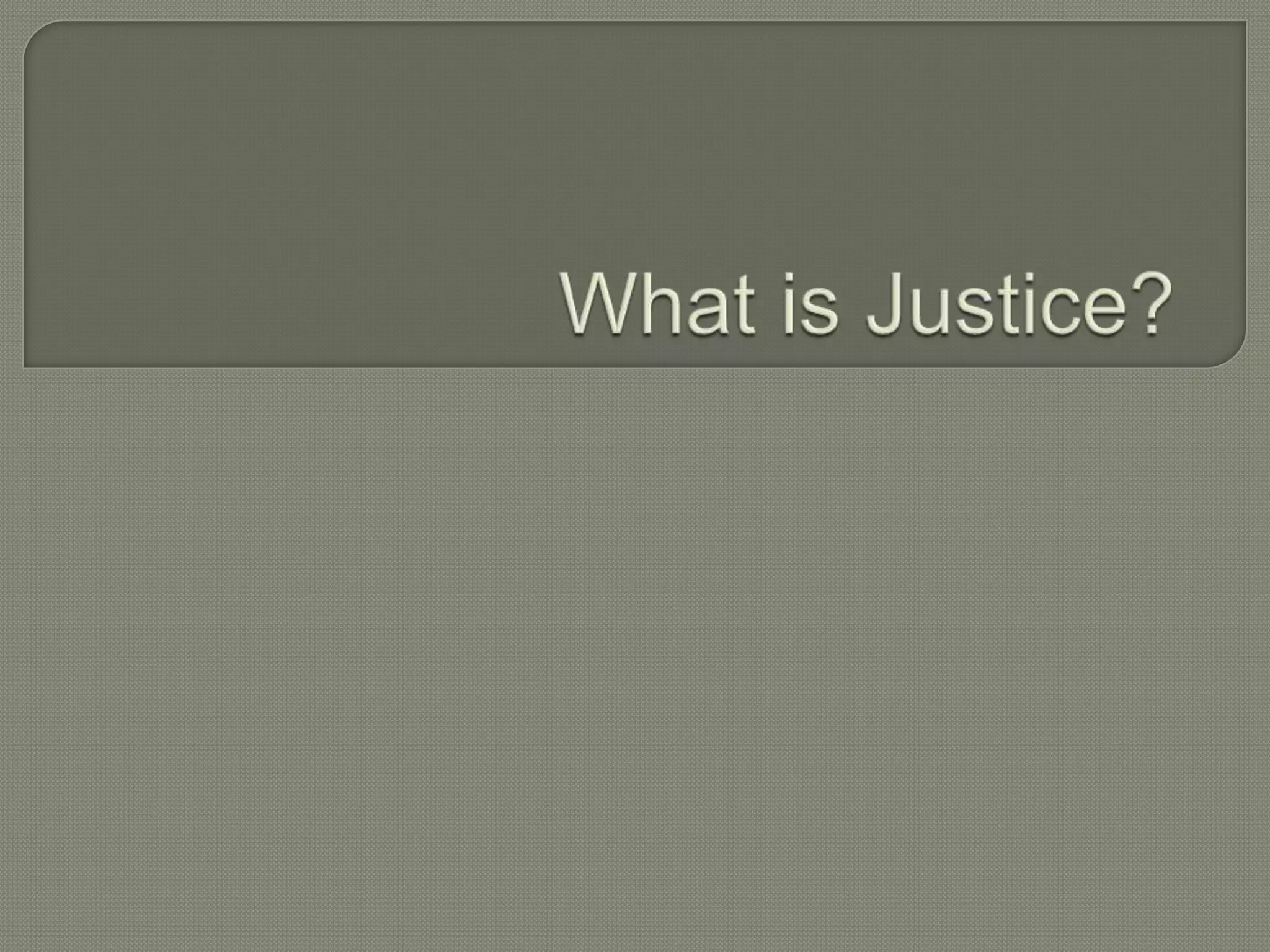 The document defines justice as fairness and reasonableness. It discusses how in any situation, such as in a courtroom, workplace, or bank, people want to be treated fairly without discrimination. A key aspect of justice is ensuring laws are administered impartially. However, disagreements often arise over what is considered a just outcome. The document explores several scenarios and whether respondents considered the outcomes as examples of justice or injustice.