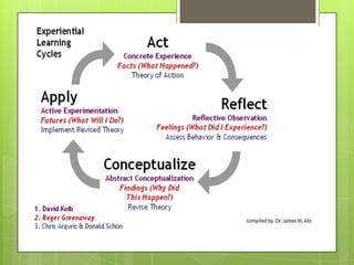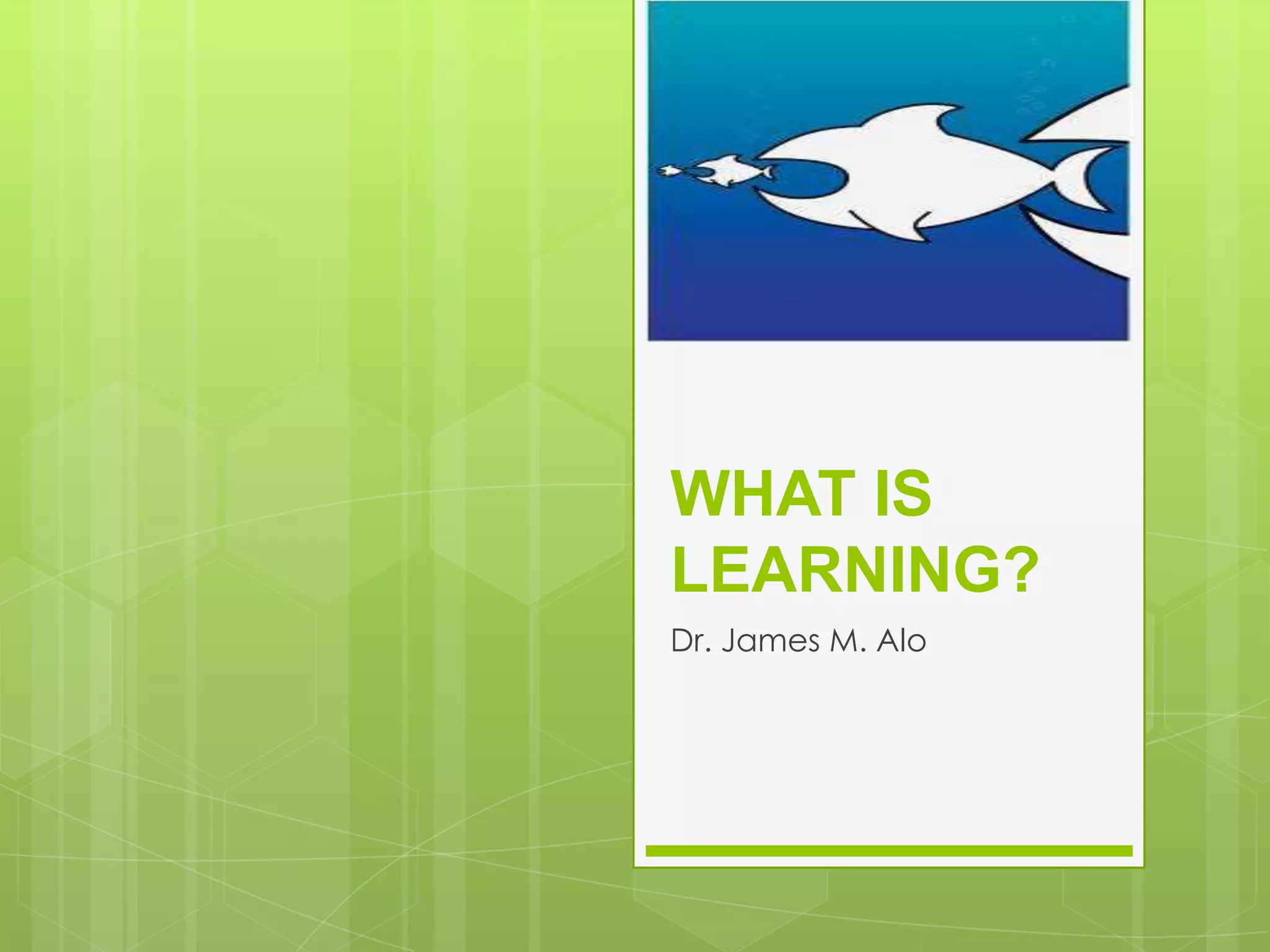 Learning involves acquiring new knowledge, behaviors, skills, values, and understanding through various methods. There are many types of learning including experiential learning through direct experience, associative learning by forming connections between elements, observational learning through imitation, and informal learning from everyday situations. Learning also involves different domains such as cognitive learning of facts, psychomotor learning of physical skills, and affective learning of values and preferences.