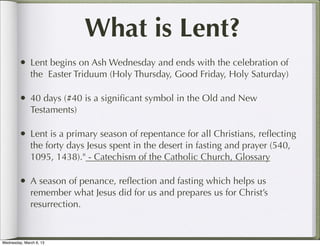 Lent is a season of penance, fasting, and prayer beginning on Ash Wednesday and ending on Holy Saturday. It is a time for reflection on Jesus' suffering and death and preparation for his resurrection. Some key aspects of Lent include receiving ashes on Ash Wednesday, fasting, abstaining from meat on Fridays, attending mass, praying the Stations of the Cross, and acts of charity. The document outlines Catholic traditions and practices observed during Lent, Holy Week, and Easter such as fasting, abstinence, Palm Sunday, Holy Thursday, Good Friday, and Easter Sunday.