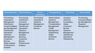 Logistics is the management of the flow of goods between the point of origin and the point of consumption to meet requirements. Logistics management plans, implements, and controls the efficient, effective, forward, and reverse flow and storage of goods, services, and information between the point of origin and the point of consumption to meet customer requirements. It involves functions like purchasing, operations, distribution, inventory management, transportation, and customer service.