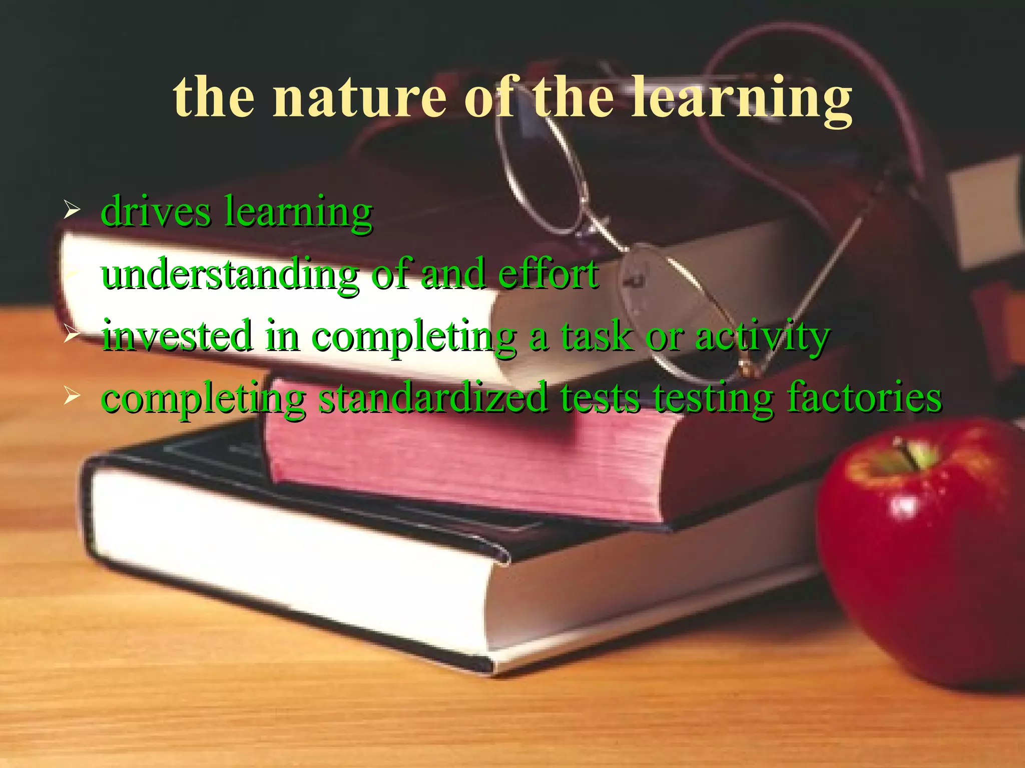The document discusses meaningful learning and how technology can foster meaningful learning. It defines meaningful learning as being active, constructive, intentional, authentic, and cooperative. It explains that technologies can support meaningful learning by allowing learners to construct knowledge, access information, collaborate, and reflect. Technologies act as tools for knowledge construction, information vehicles, authentic learning contexts, social mediums for conversation, and intellectual partners for reflection.