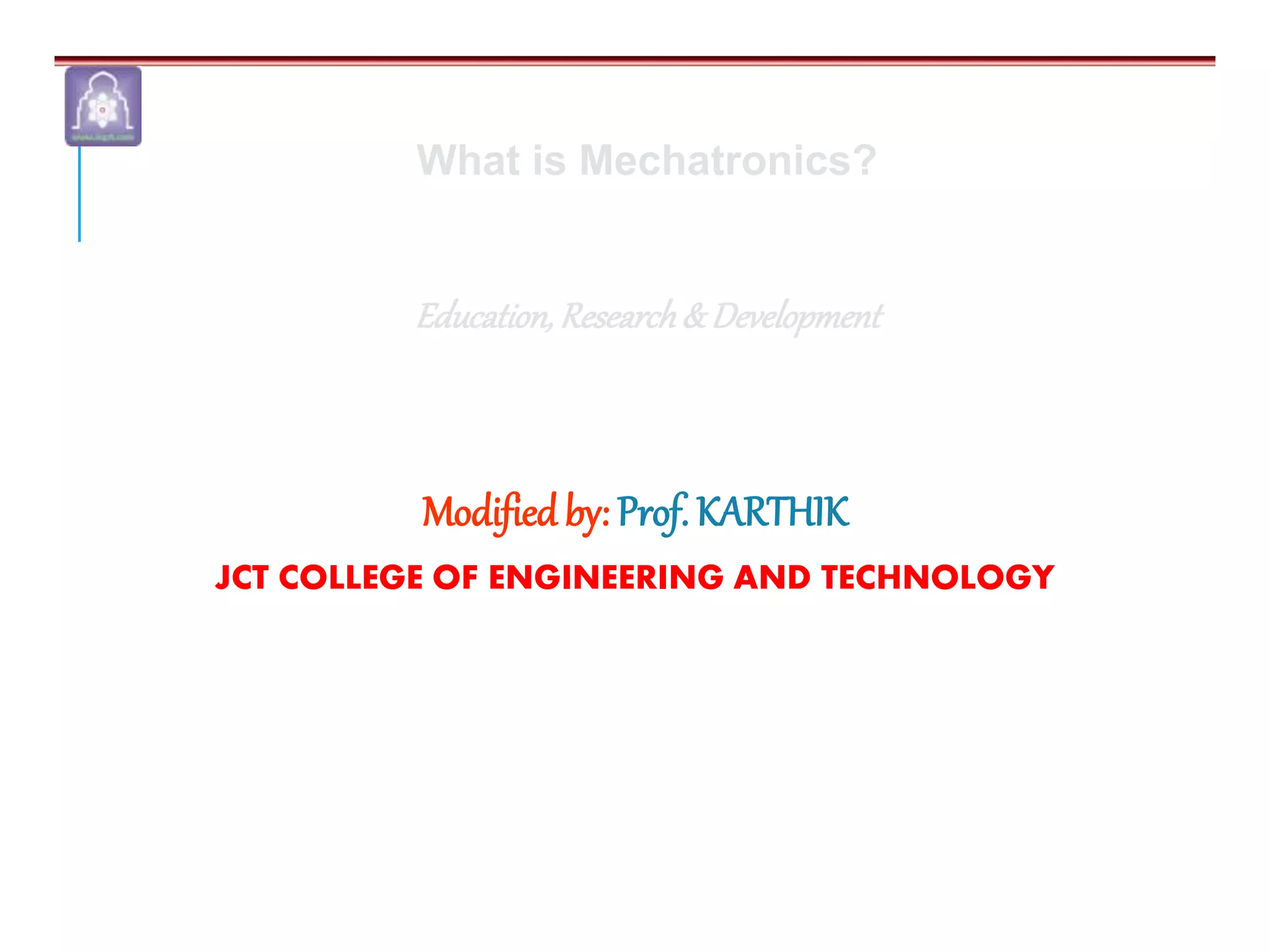 Mechatronics combines mechanical, electrical, and computer engineering to design and manufacture products. It involves integrating mechanical and electrical systems with software to create more reliable and cost-effective systems. Mechatronics curricula includes courses in engineering fundamentals, programming, electronics, robotics, and embedded systems. Labs focus on software, CAD, digital electronics, and integrating electrical and mechanical components. The field draws on disciplines like controls, robotics, automation, and computer interfaces.
