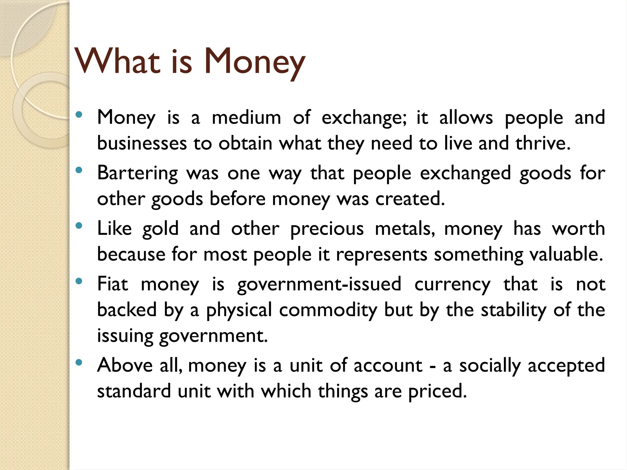 Money serves as a medium of exchange, allowing transactions and representing value, evolving from bartering systems. Its primary functions include facilitating payments and measuring value, while secondary functions encompass standards for future payments, storing value, and transferring value both domestically and internationally.