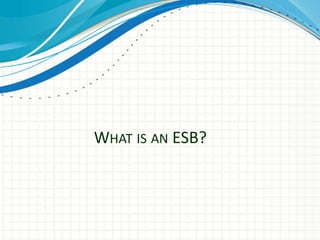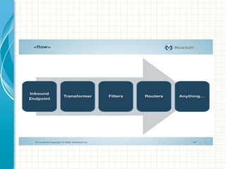Mule ESB is a lightweight and scalable Java-based messaging framework that allows for quick and easy integration of applications and data exchange between them. It uses a service-oriented architecture and supports integration with various technologies through different endpoints. Key features include being lightweight, supporting more than just mediation, being accessible to any developer through common tools, and being able to scale up or down through embeddability and cloud deployment on CloudHub. Mule ESB provides core integration capabilities like message processing, routing, and transformation through reusable components in a visual flow-based development environment.