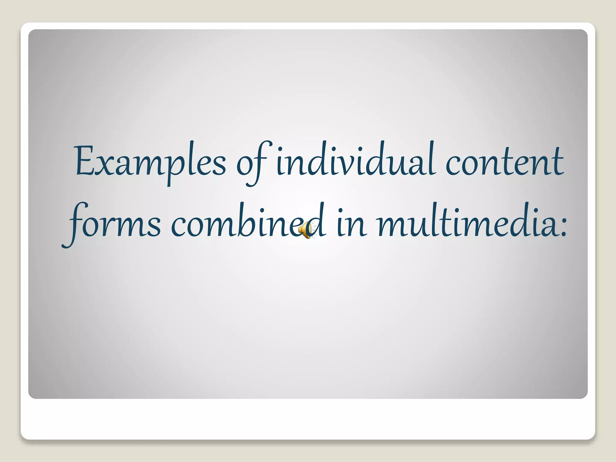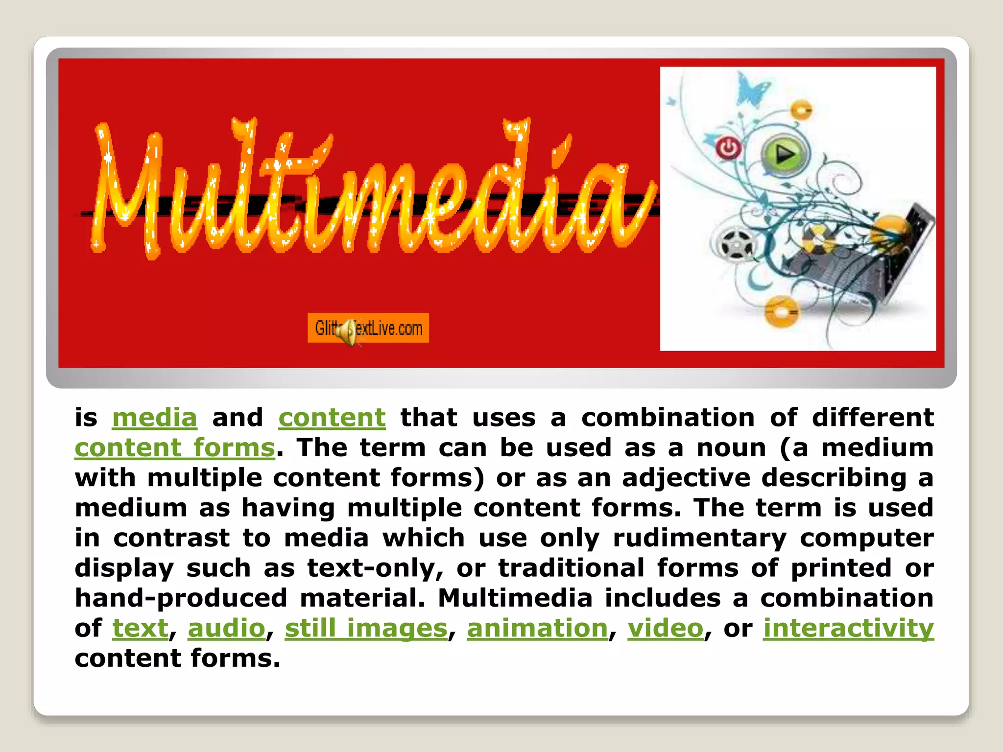 Multimedia refers to content that uses a combination of different content forms, such as text, audio, images, video and interactivity. It is used with electronic devices and can be either linear or non-linear. Examples of multimedia include presentations, broadcasts, games and simulations that integrate several media formats to enhance the experience of users. Teachers now have new tools like computers, the internet, projectors and presentation software to incorporate multimedia into their lessons in engaging ways.