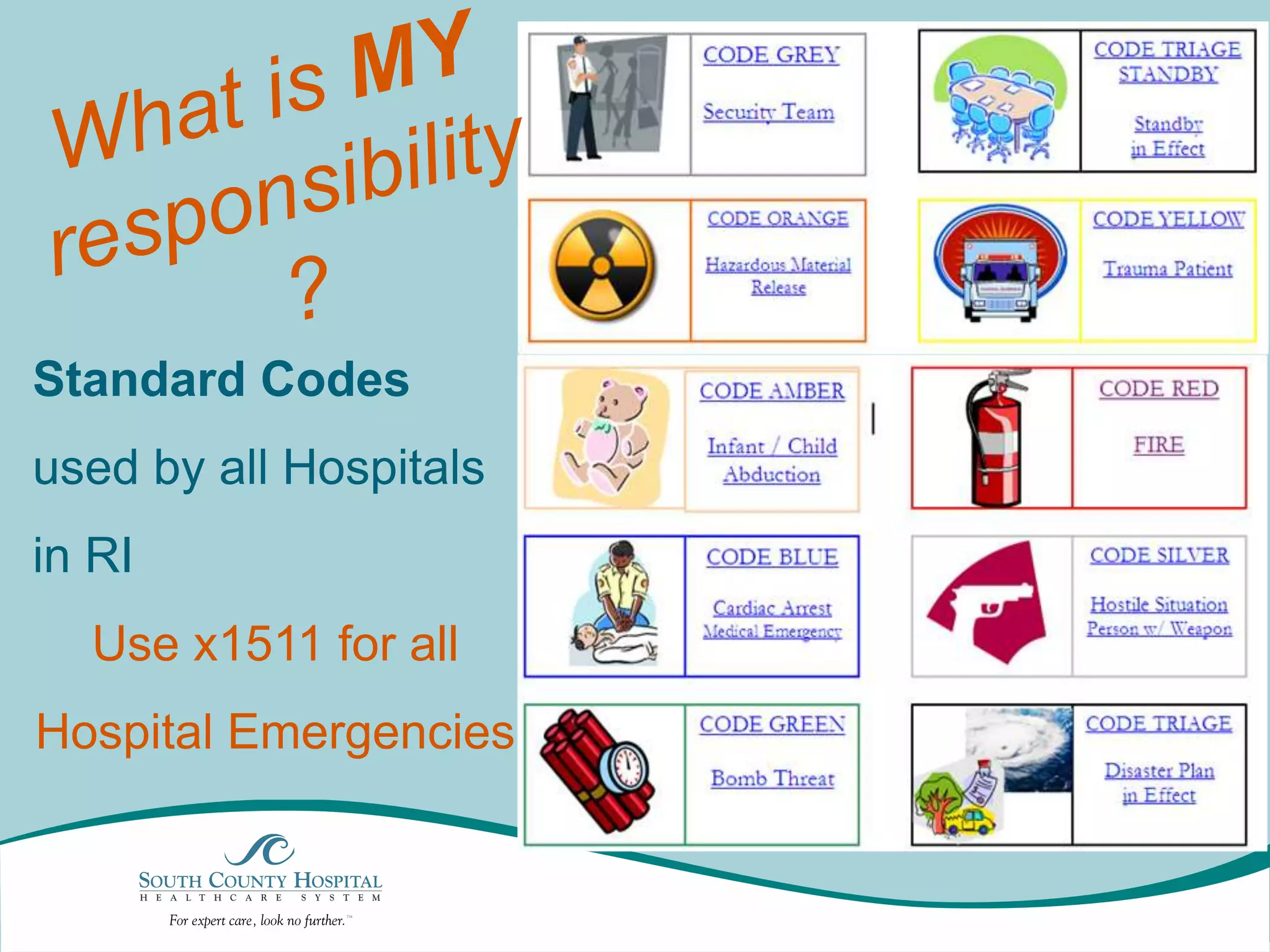The document provides codes and procedures for various emergency situations at hospitals in Rhode Island. It summarizes codes for fire (Code Red), fire alarm system issues (Code 78), cardiac arrest (Code Blue), child abduction (Code Amber), person with a weapon (Code Silver), bomb threat (Code Green), security assistance needed (Code Grey), preparing for a mass casualty event (Code Triage Standby), active mass casualty response (Code Triage), hazardous material spill (Code Orange), and trauma team response (Code Yellow). Staff are instructed to call an emergency operator to report the code and follow specific response procedures depending on the emergency situation.