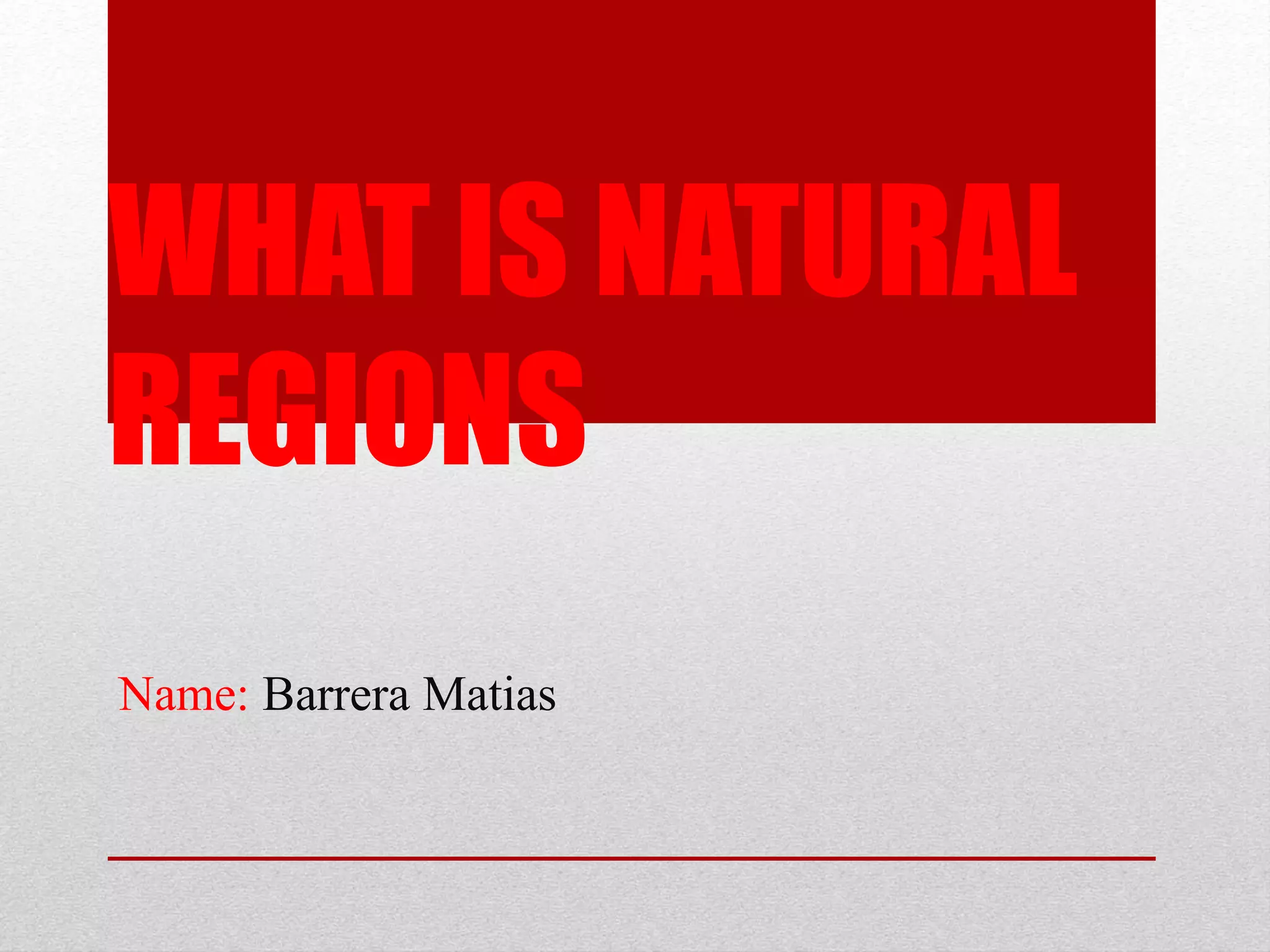 A natural region is a basic geographic unit distinguished by common natural features of geography, geology, and climate. The document provides examples of natural regions in Ecuador such as the Costa, Sierra and Oriente regions, and the Galapagos Islands. Images are also included to illustrate natural regions.