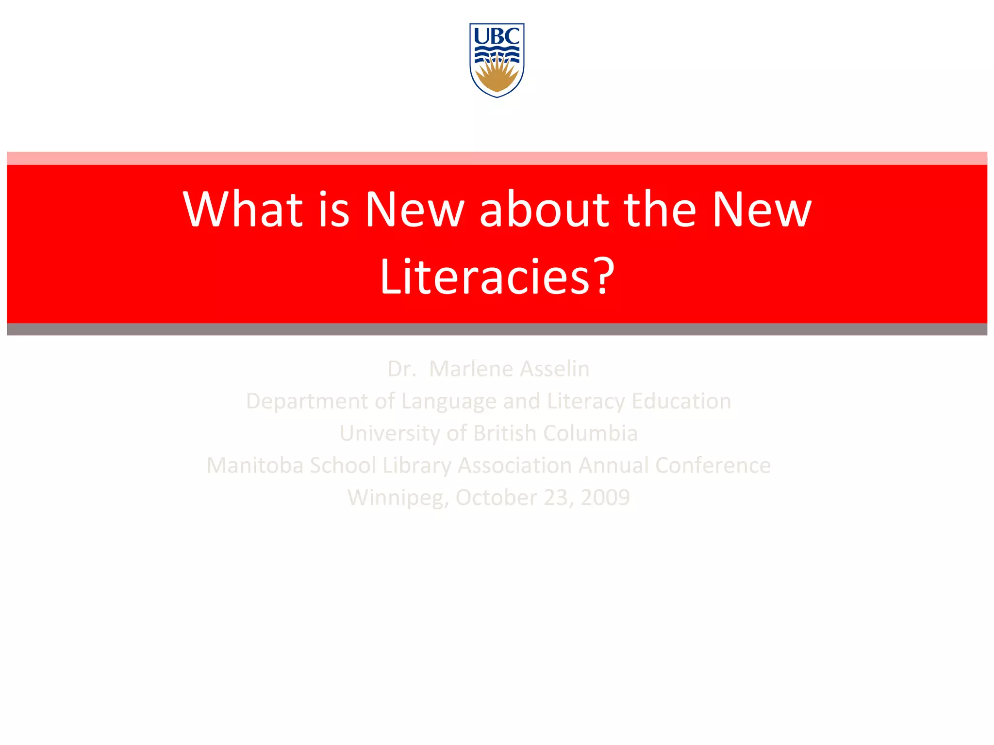 Dr. Marlene Asselin gave a presentation on new literacies at the Manitoba School Library Association Annual Conference. She discussed key differences between print-based and new literacies, major theories around new literacies, and educational issues arising from new perspectives on literacy. She emphasized how new literacies involve expanded opportunities for multi-modal content production and knowledge sharing through social practices and participation.
