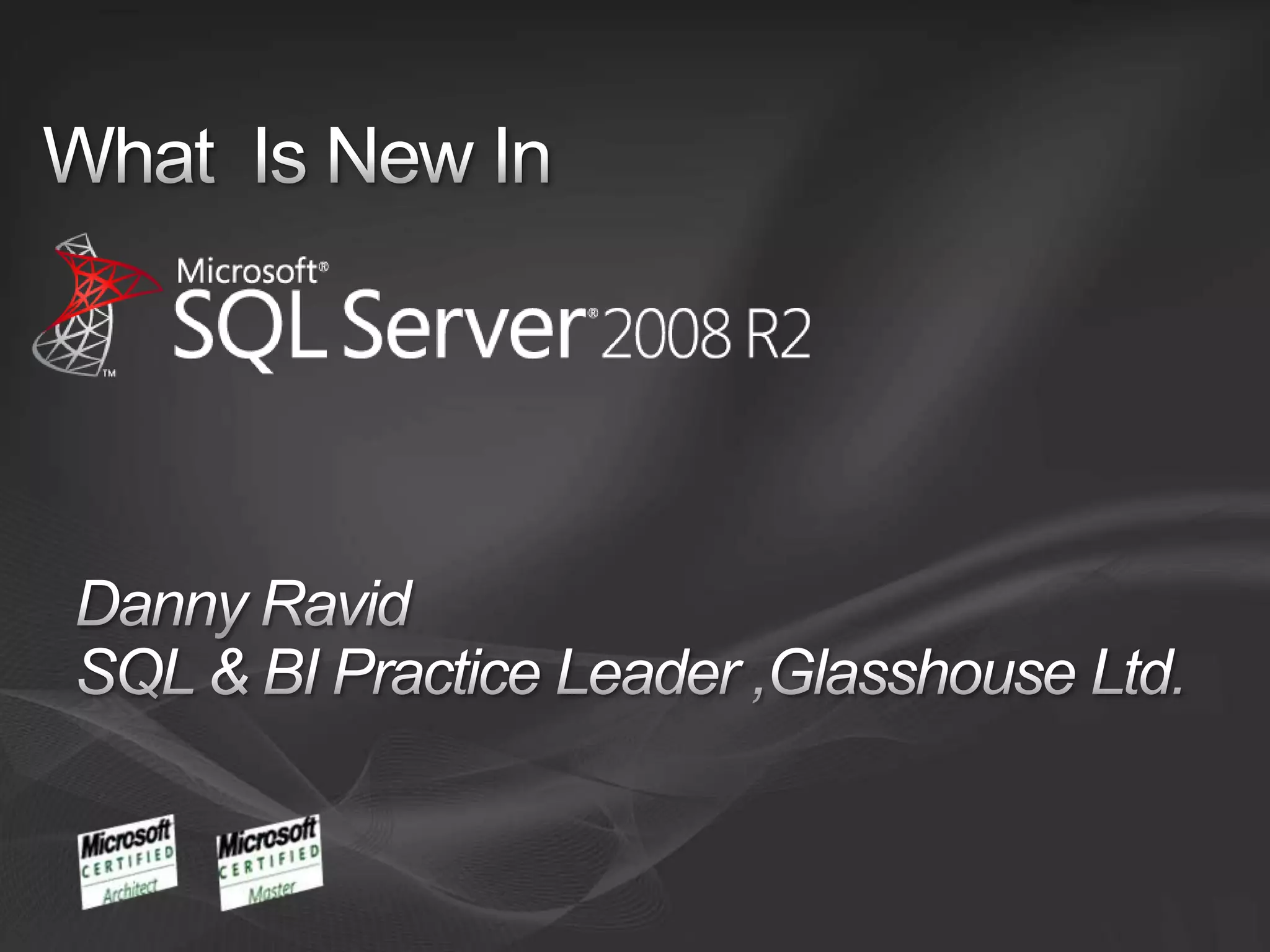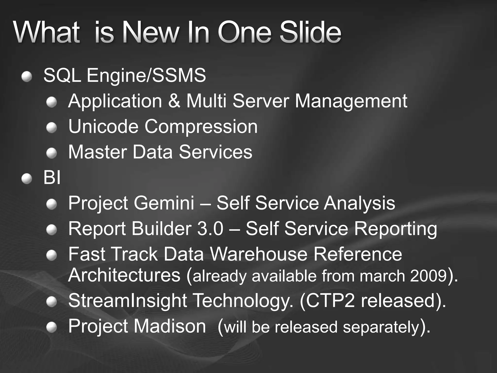 The document summarizes new features and upcoming projects in SQL Server and BI. Key points include: improved SQL engine and management tools; Master Data Services; self-service analysis and reporting projects; reference architectures for petabyte data warehouses; and Project Madison for appliance-like data warehouses running on industry standard hardware. Project Gemini will provide self-service analysis in Excel with in-memory analytics and sharing capabilities.
