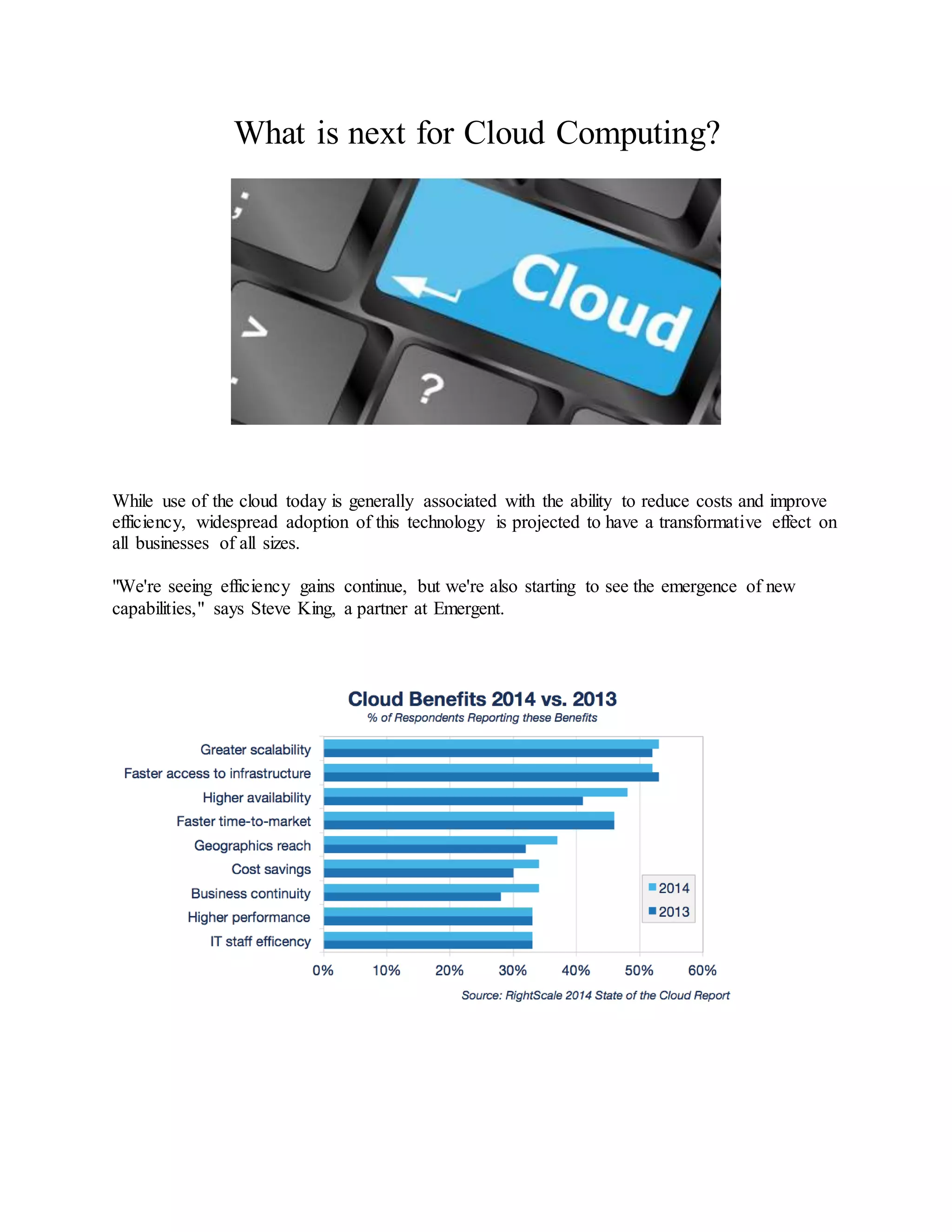 Cloud computing adoption is projected to transform businesses of all sizes over the next few years. While efficiency gains are being seen today, new capabilities are emerging. Cloud computing influences IT service delivery models and data center operations. Over the next three years, hybrid cloud computing, cloud services brokerages, and cloud-centric design will accelerate. More applications and increased innovation are expected to come from greater cloud adoption and development.
