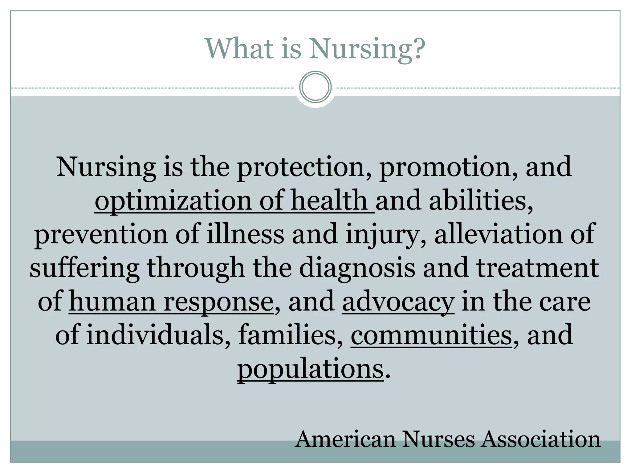 Nursing involves promoting health, preventing illness, alleviating suffering, diagnosing and treating human responses to illness. Nurses protect patients, recognize them as whole individuals, and help patients understand their health needs and navigate the healthcare system. Nurses are problem solvers, guardians, and cost-effective members of the healthcare team who save lives, prevent suffering, and save money through their medical knowledge and caring approach.