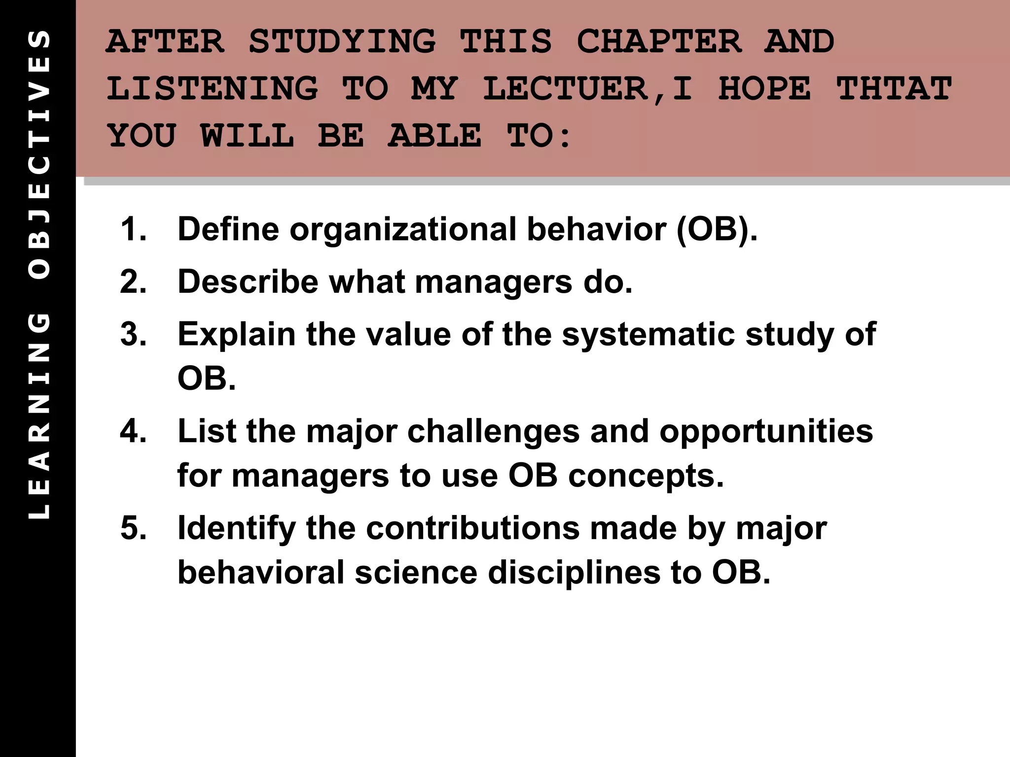 This document outlines an organizational behavior lecture, including learning objectives, definitions of key terms, and contributing disciplines. It discusses what managers do through activities like decision making, resource allocation, and directing others. Management functions are defined including planning, organizing, leading, and controlling. Challenges and opportunities for applying organizational behavior concepts are improving people skills, empowering employees, stimulating innovation and managing diversity. The dependent variables in organizational behavior are also defined.