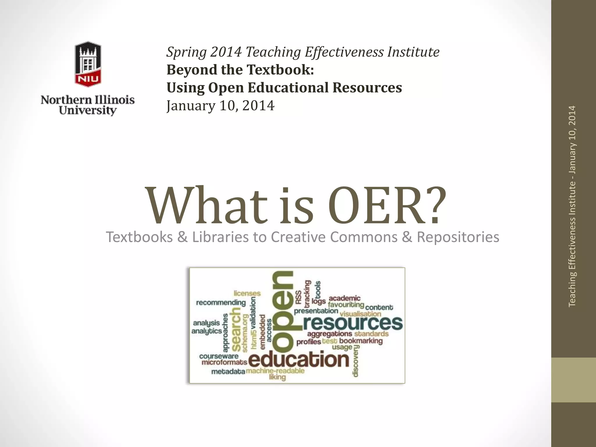 The document explains Open Educational Resources (OER), emphasizing their key features of accessibility, adaptability, and sharing. It discusses the evaluation process for selecting effective OER, including alignment with learning objectives, copyright conditions, and accessibility for students. Additionally, it provides guidance on searching for and curating quality educational materials to enhance the learning experience.