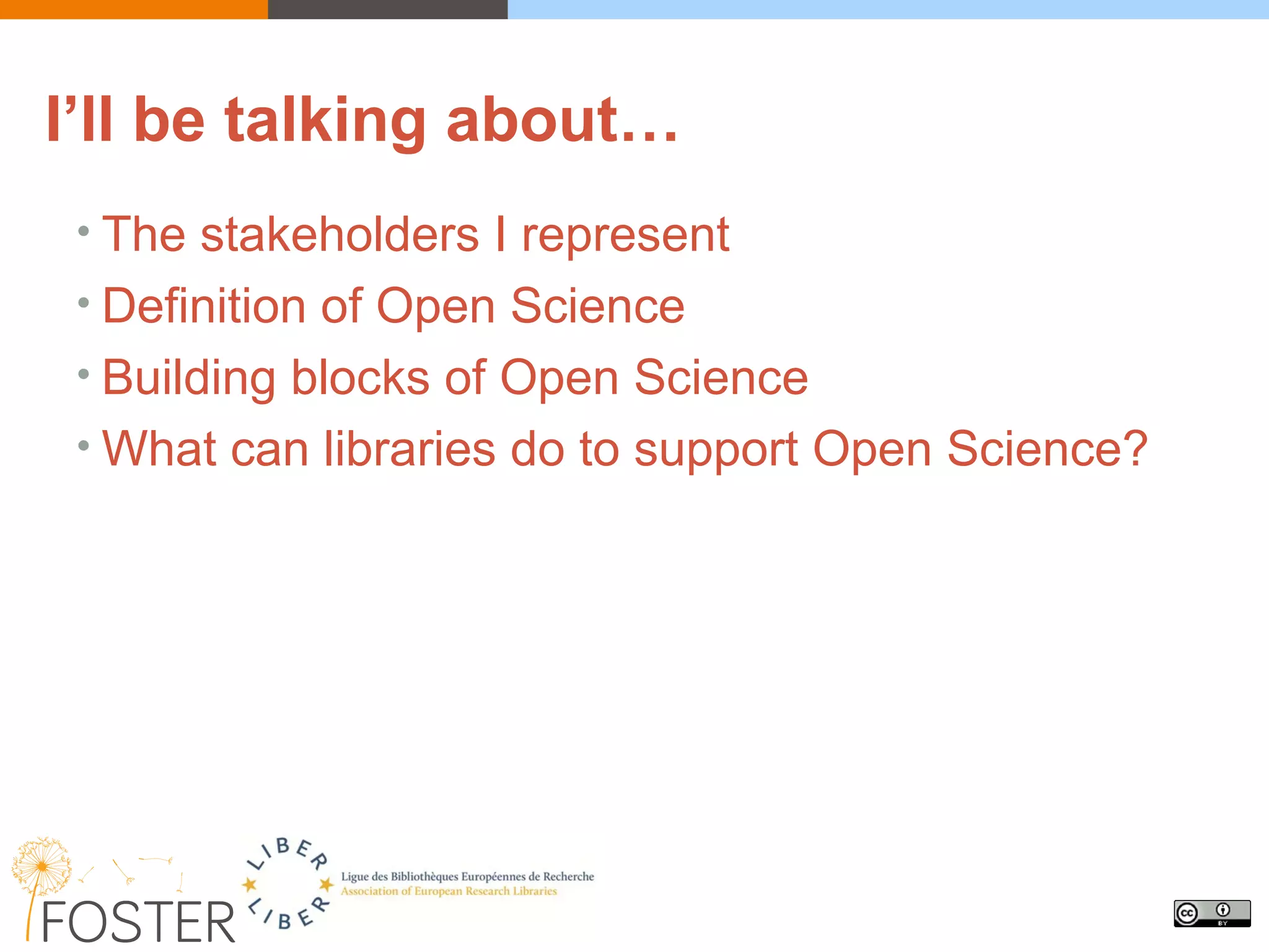 The document discusses the concept of open science from a stakeholder perspective, emphasizing its definition as collaborative and transparent scientific practices that make research data and processes freely accessible. It highlights the importance of various building blocks such as open access, open data, advocacy, infrastructure, skills training, and policy support necessary for implementing open science. Furthermore, it outlines the role of libraries in facilitating open science through research data management, training, and promoting relevant policies.