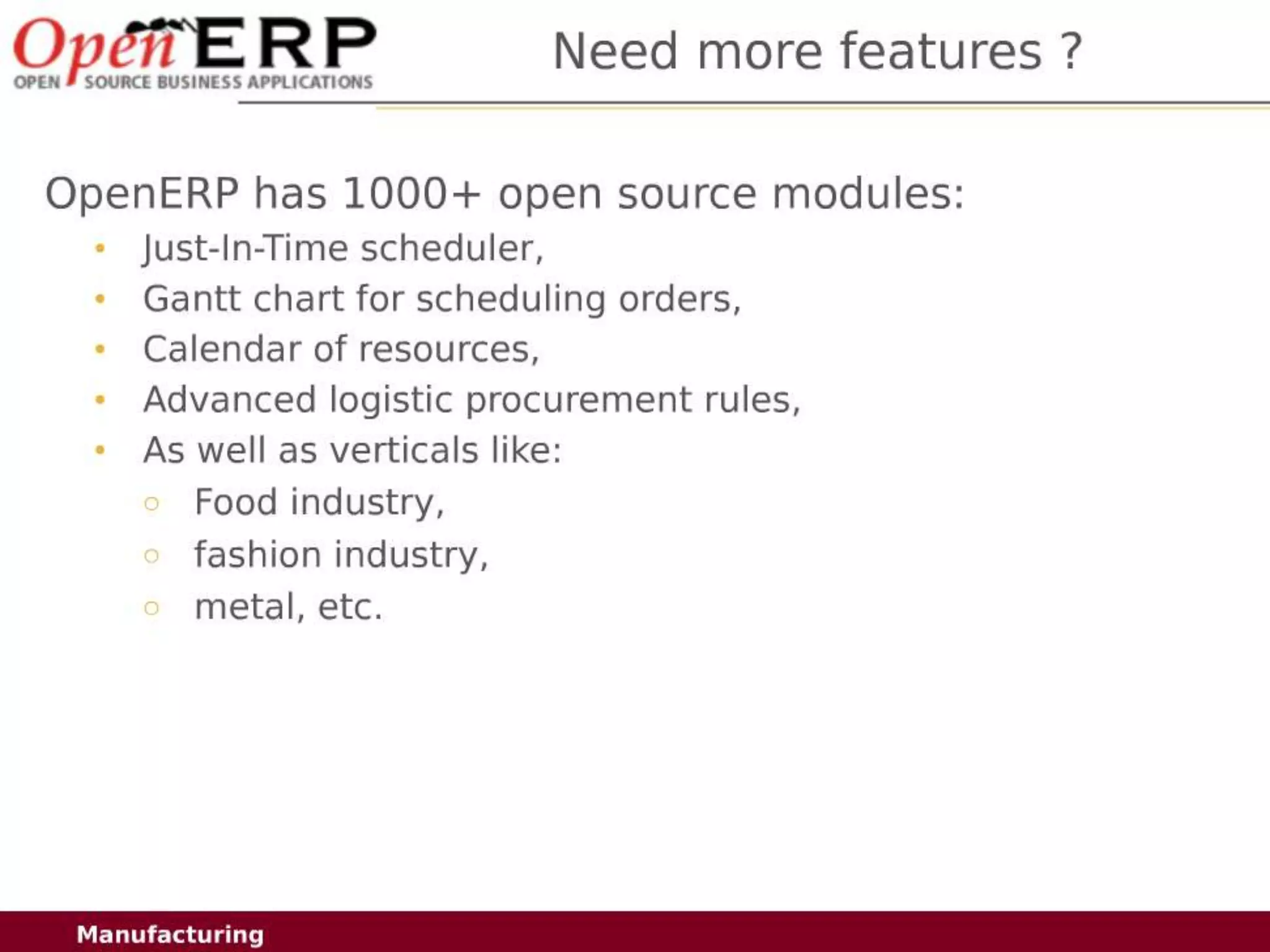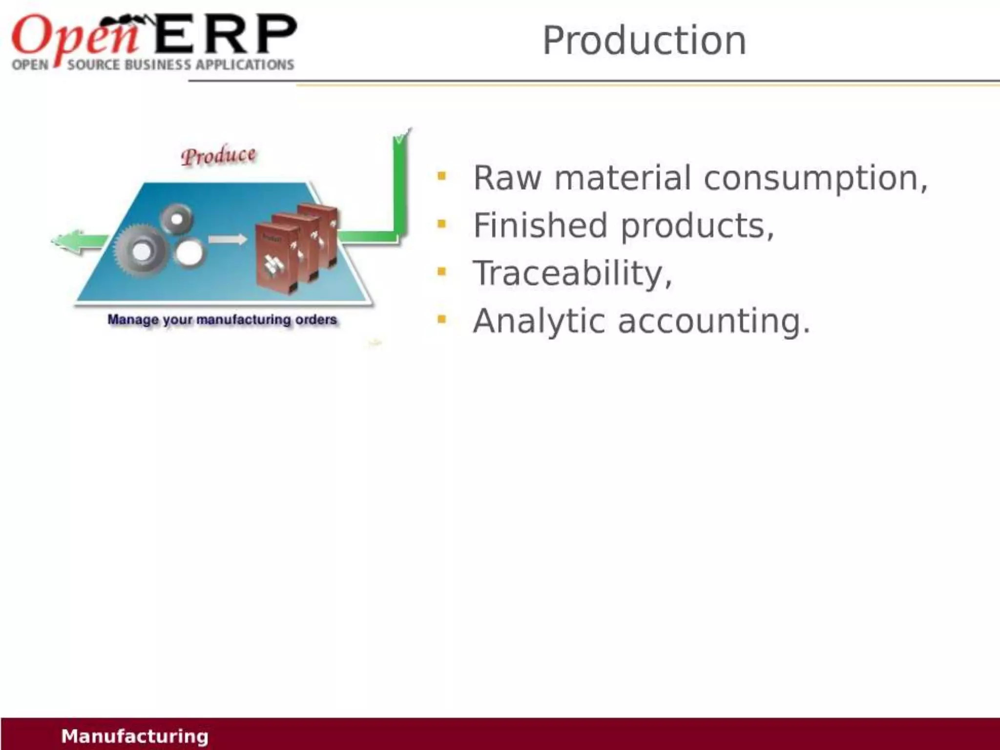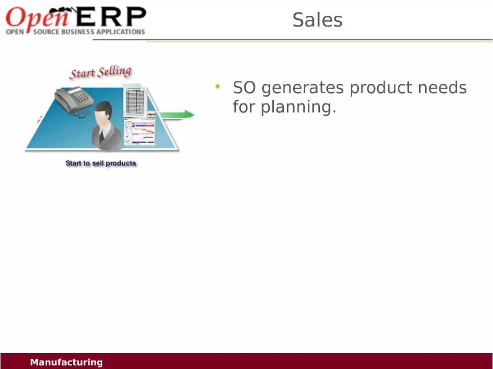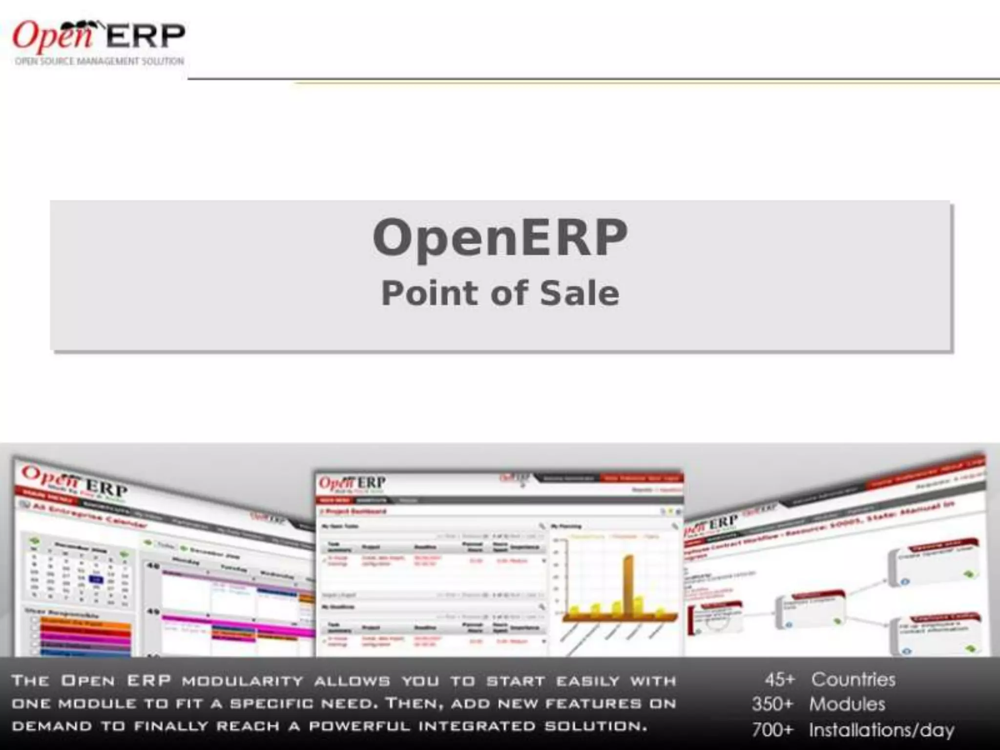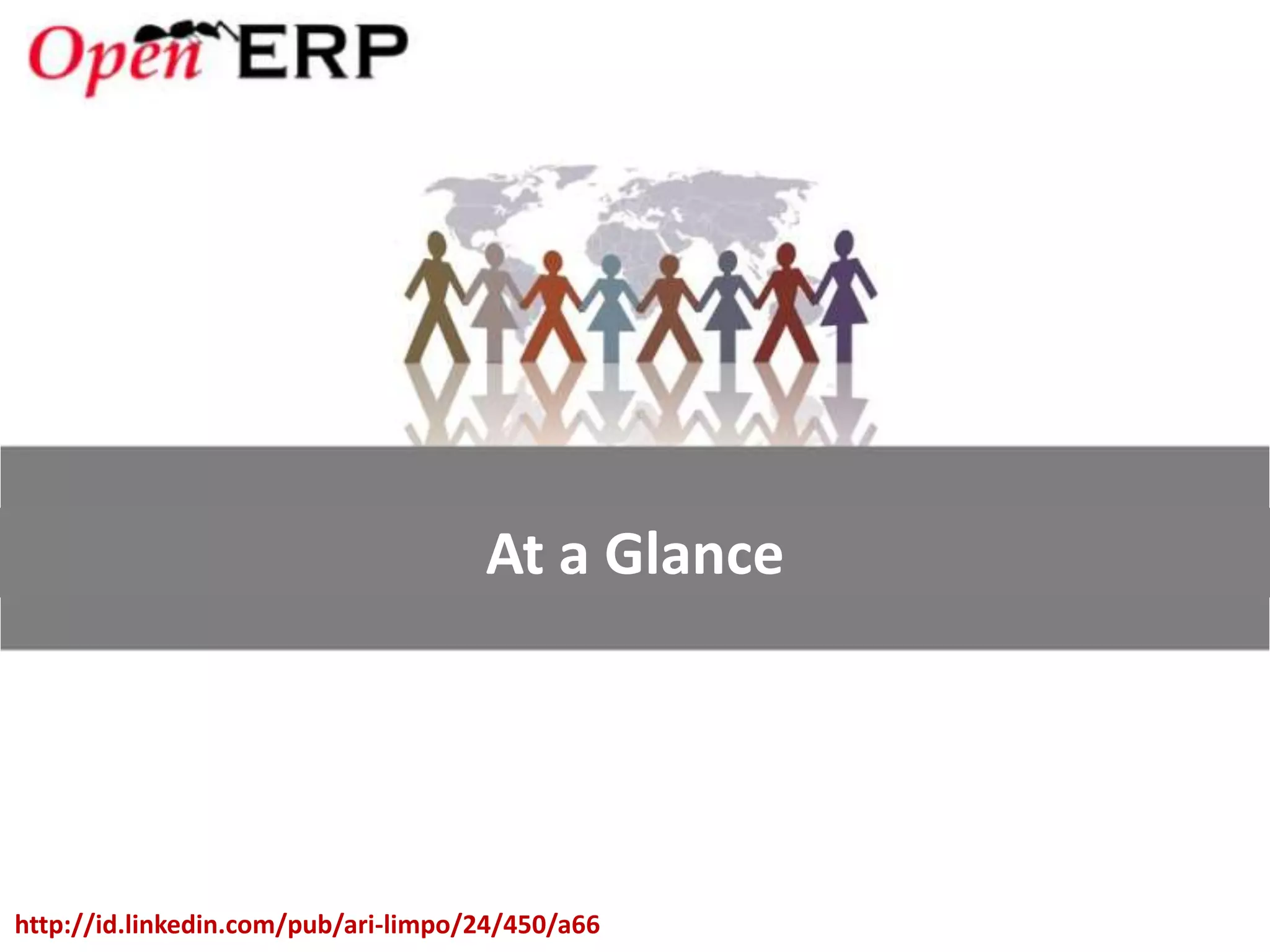 This document provides an overview of the OpenERP open source ERP software. It describes OpenERP as being open source, comprehensive with over 700 modules, modular allowing customers to start with one application and add more later, flexible allowing customization of the user interface, and affordable with no license fees. It also discusses OpenERP's vision of making business applications affordable for any company, its business model of leveraging community contributions and a volume sales model, and provides highlights of key features for various OpenERP functional modules.