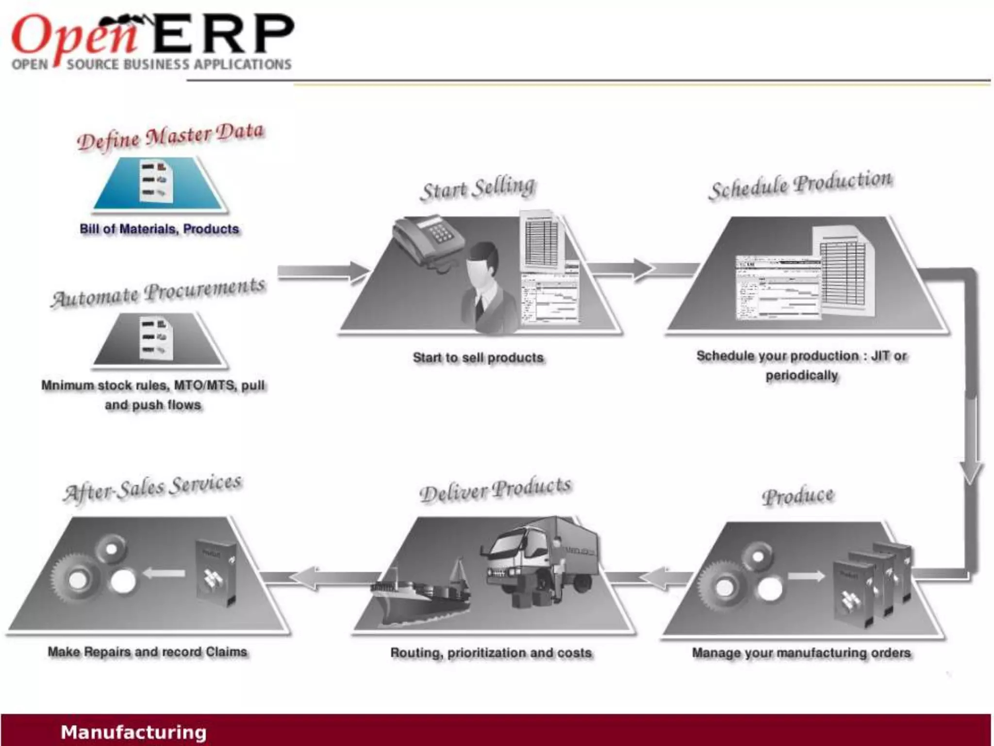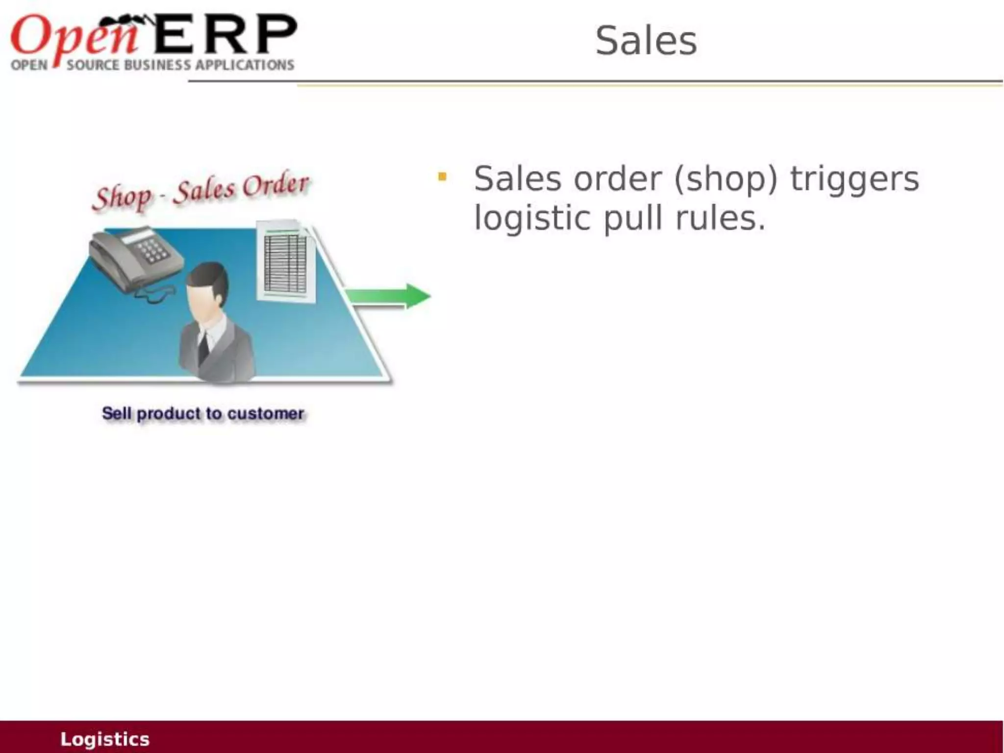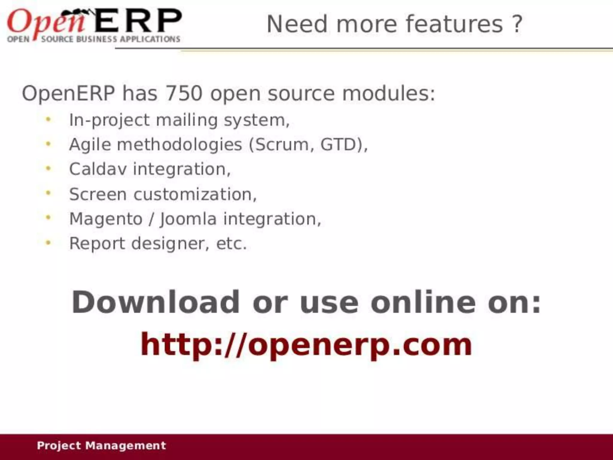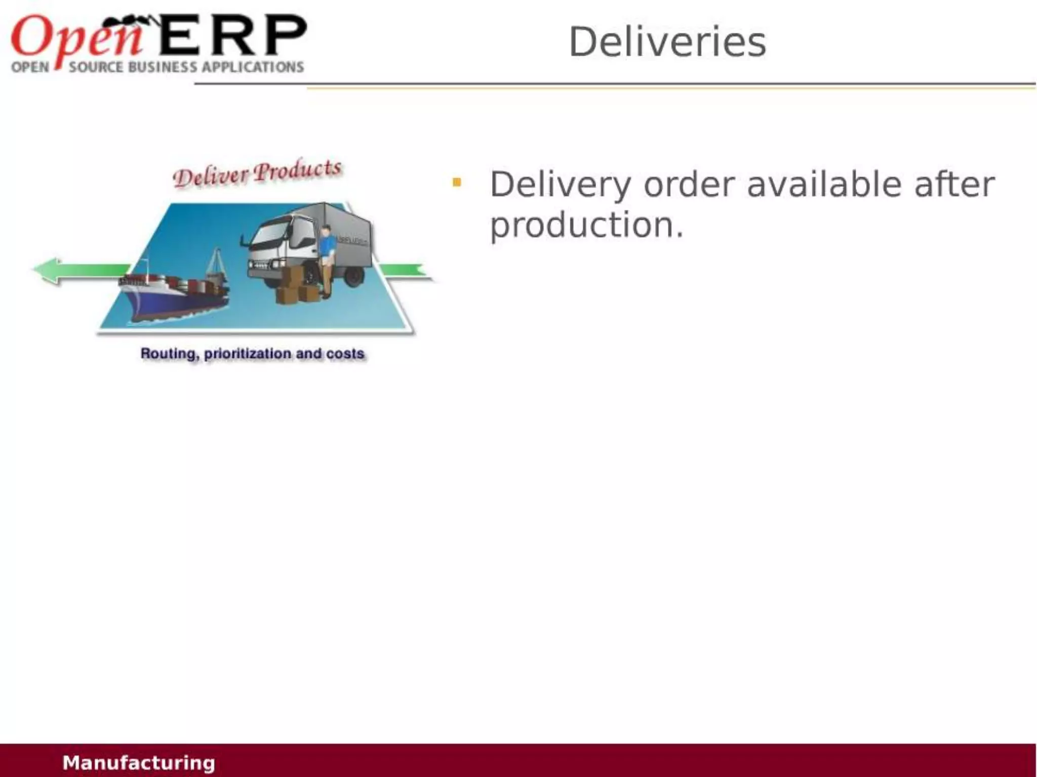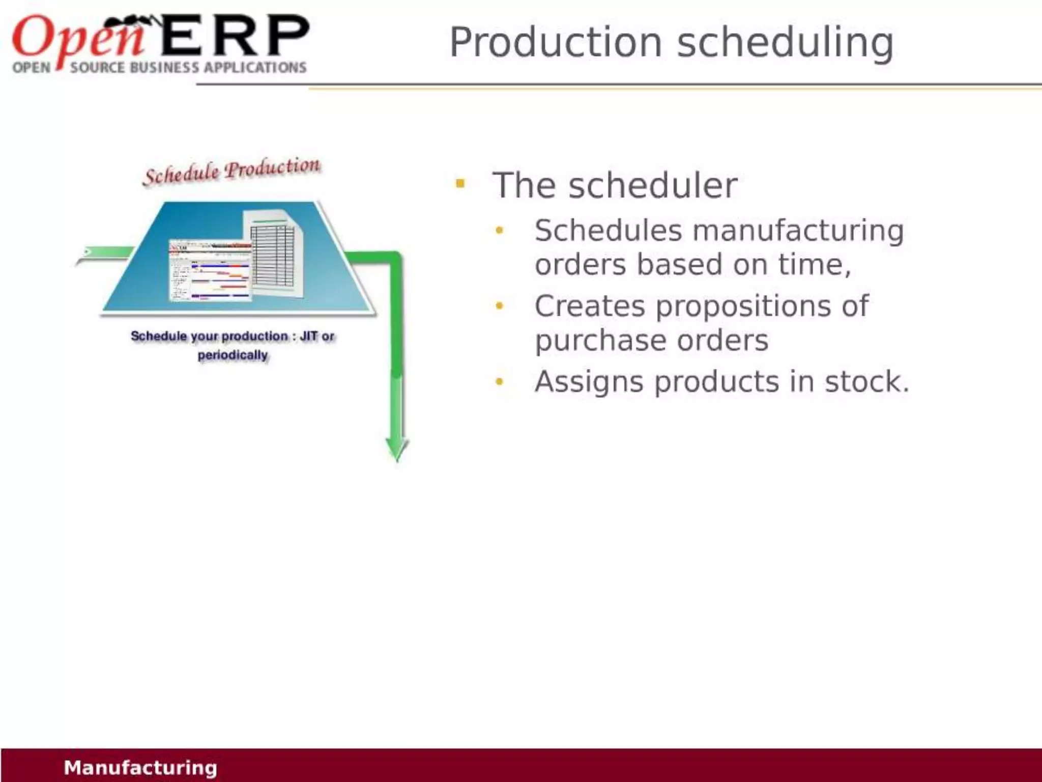 This document provides an overview of the OpenERP open source ERP software. It describes OpenERP as being open source, comprehensive with over 700 modules, modular allowing customers to start with one application and add more later, flexible allowing customization of the user interface, and affordable with no license fees. It also discusses OpenERP's vision of making business applications affordable for any company, its business model of leveraging community contributions and a volume sales model, and provides highlights of key features for various OpenERP functional modules.