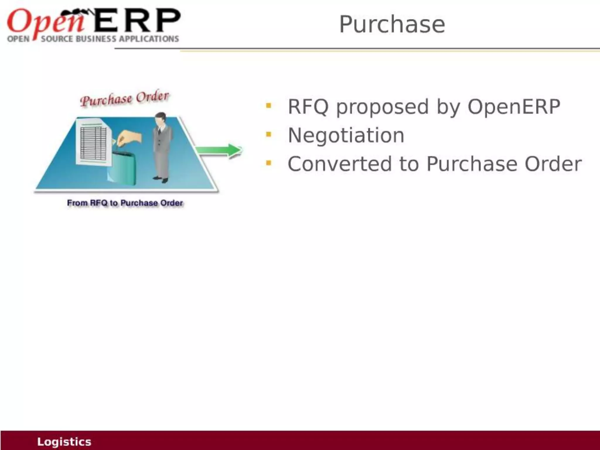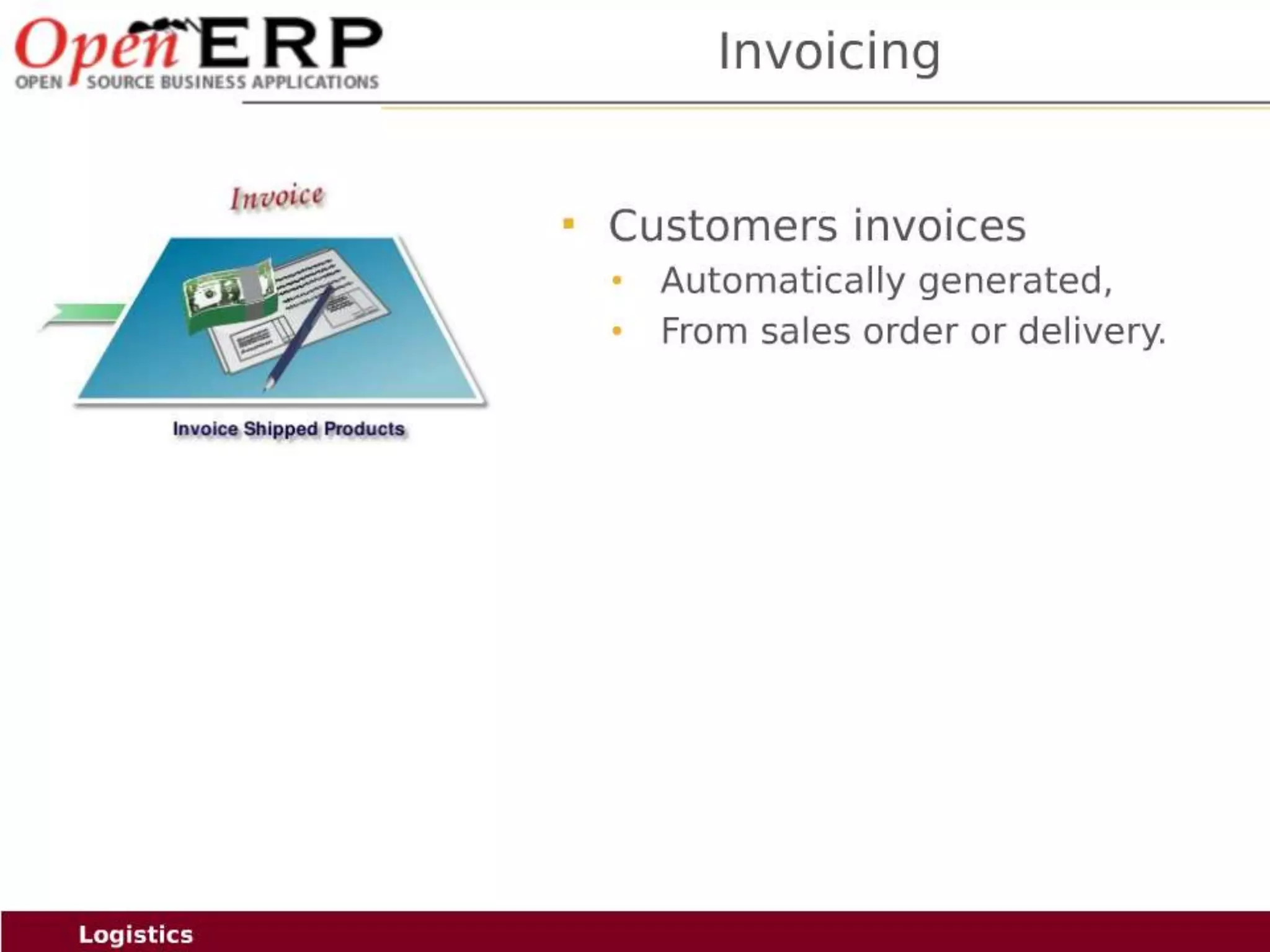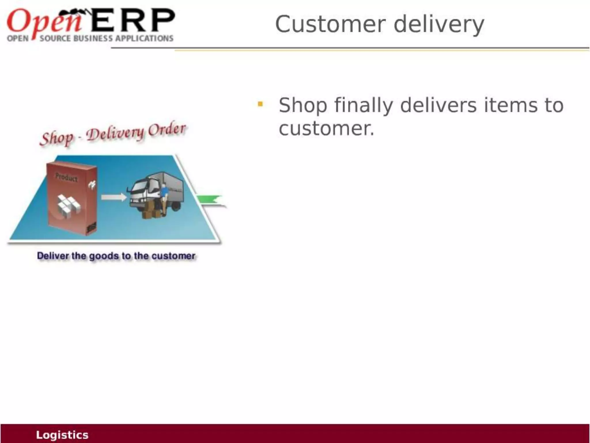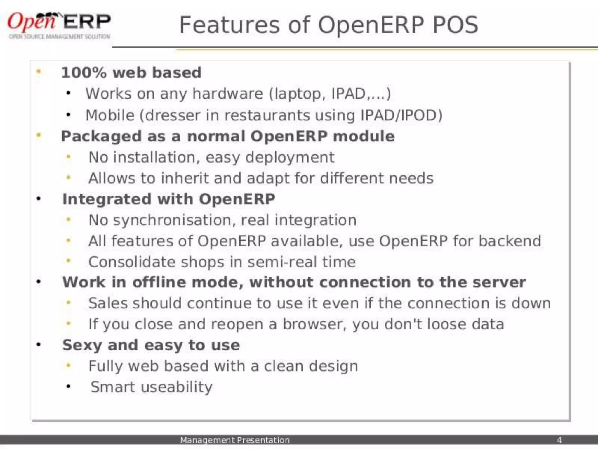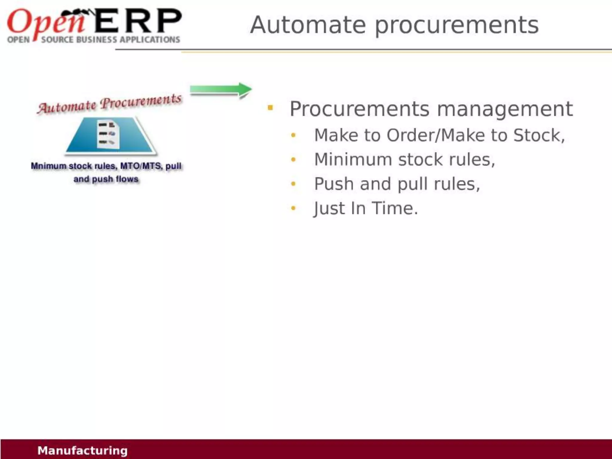 This document provides an overview of the OpenERP open source ERP software. It describes OpenERP as being open source, comprehensive with over 700 modules, modular allowing customers to start with one application and add more later, flexible allowing customization of the user interface, and affordable with no license fees. It also discusses OpenERP's vision of making business applications affordable for any company, its business model of leveraging community contributions and a volume sales model, and provides highlights of key features for various OpenERP functional modules.
