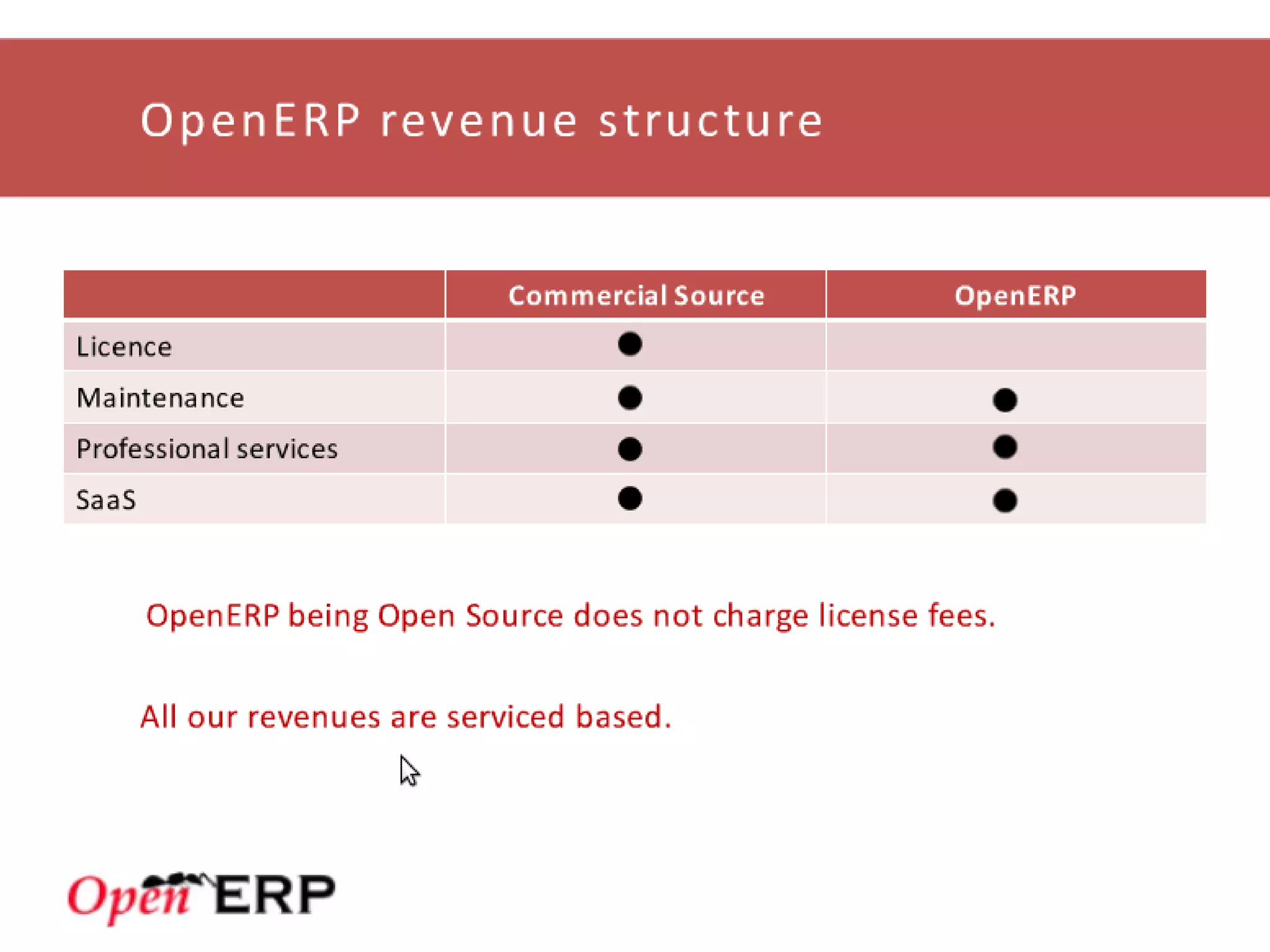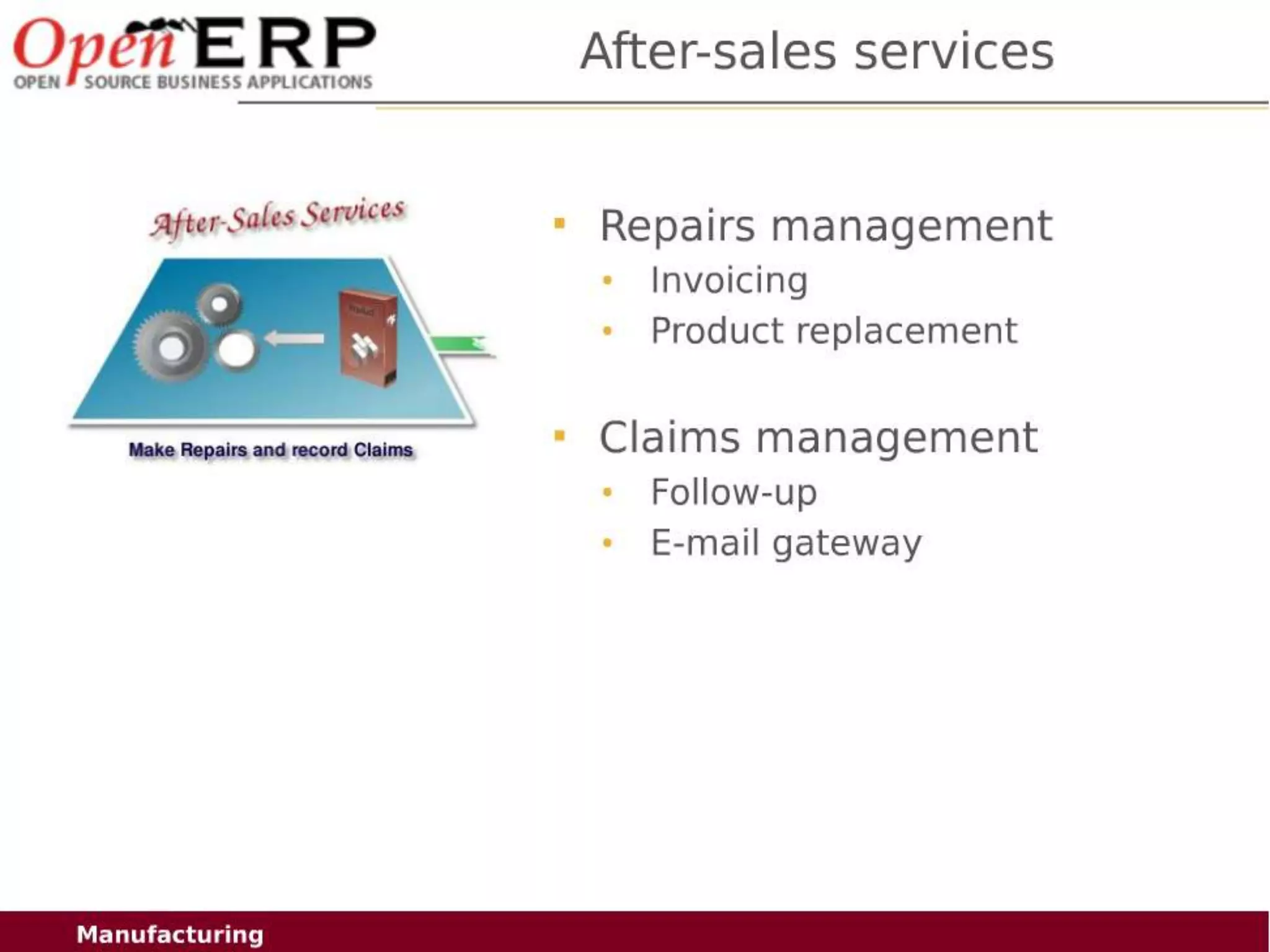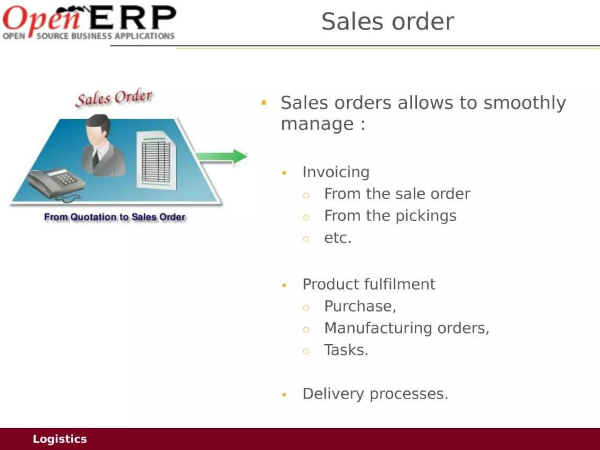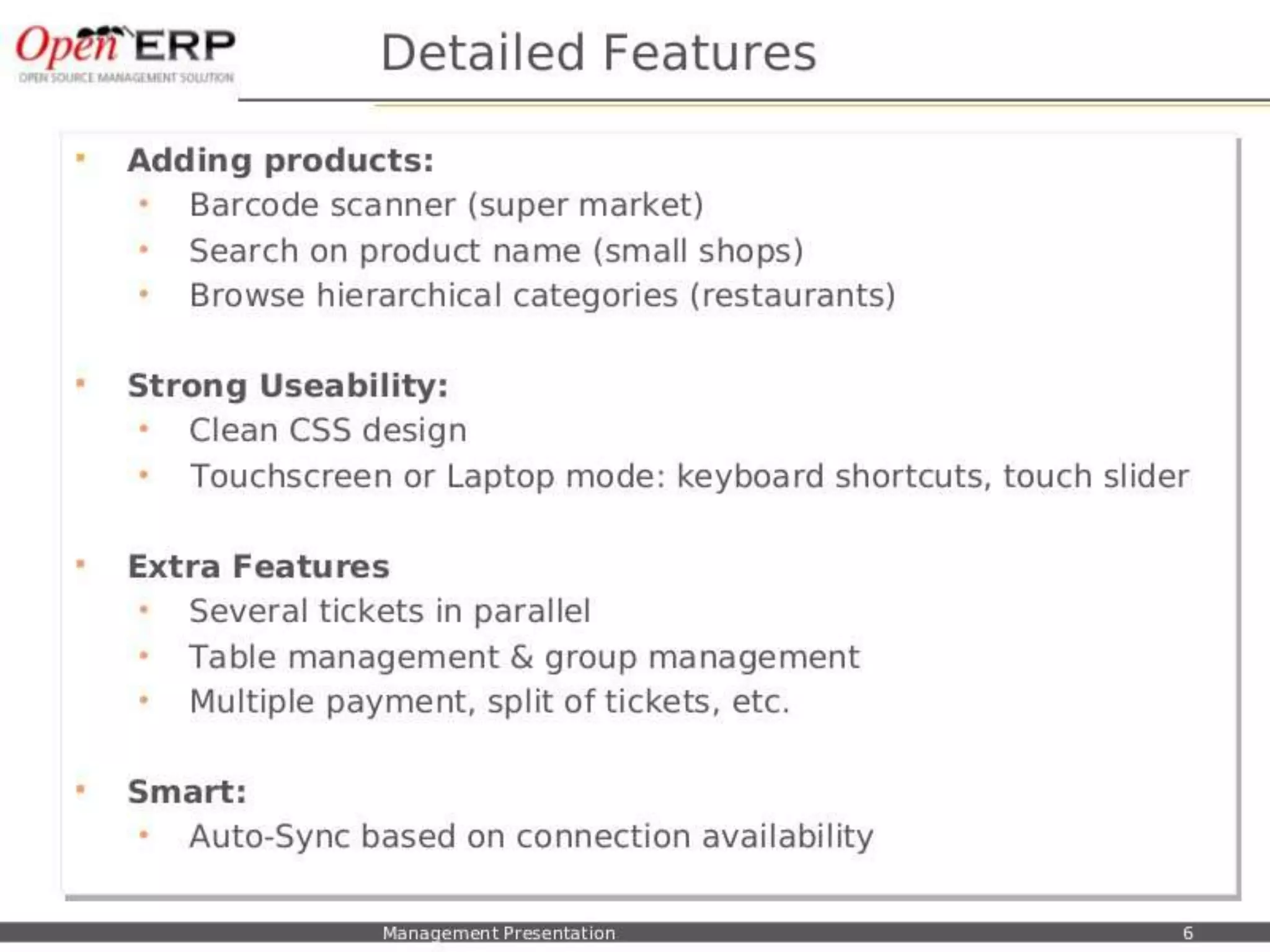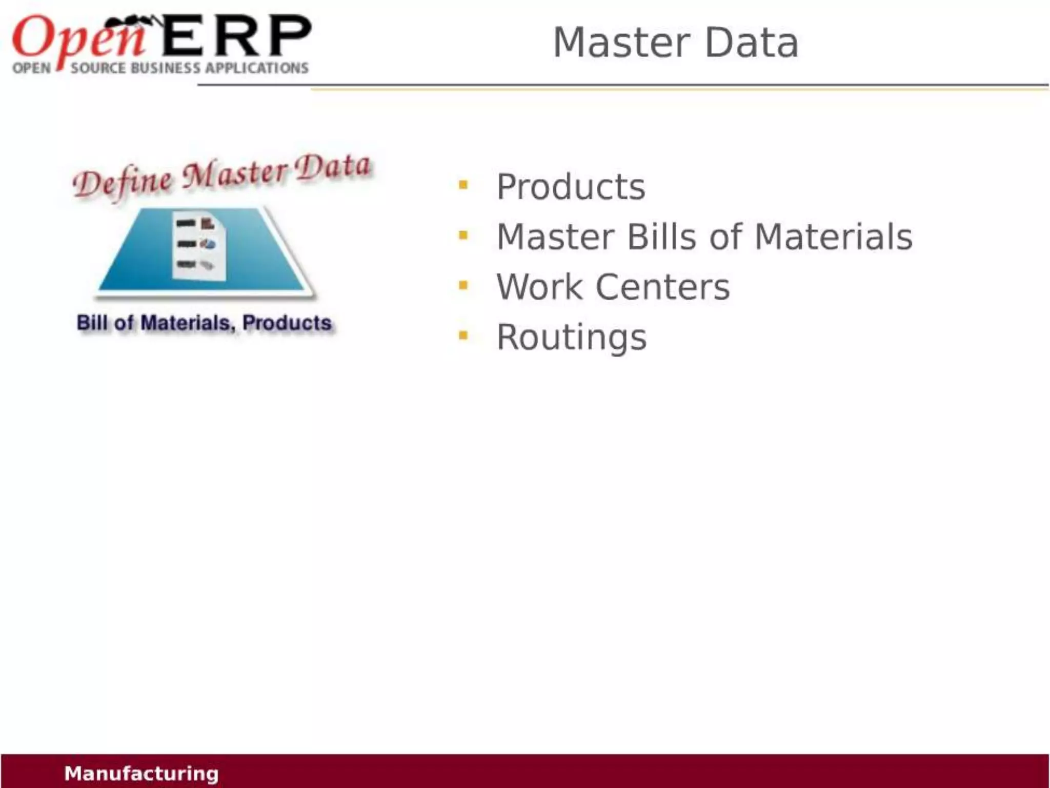 This document provides an overview of the OpenERP open source ERP software. It describes OpenERP as being open source, comprehensive with over 700 modules, modular allowing customers to start with one application and add more later, flexible allowing customization of the user interface, and affordable with no license fees. It also discusses OpenERP's vision of making business applications affordable for any company, its business model of leveraging community contributions and a volume sales model, and provides highlights of key features for various OpenERP functional modules.
