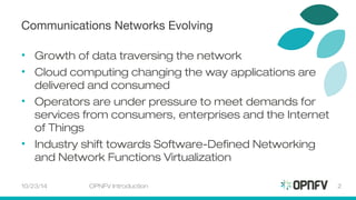 OPNFV is an open source project that aims to develop an integrated and tested open source platform for network functions virtualization (NFV) to help operators meet increasing demands on networks. The project was launched in September 2014 and is supported by telecom operators and vendors. It will integrate existing open source NFV components and develop new code to provide a carrier-grade reference platform for NFV that supports performance, scale, and reliability requirements of networks.