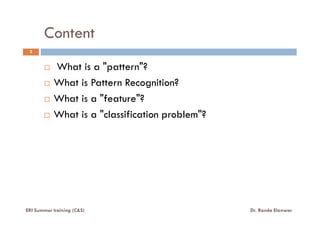 The document discusses fundamental concepts in pattern recognition, including definitions of patterns, classification problems, and the importance of features in identifying and distinguishing entities. It explains the difference between identification, recognition, and classification, using examples such as face recognition and speech recognition. The document also highlights the challenges in creating effective classification models and the role of machine learning in automating the decision-making process.