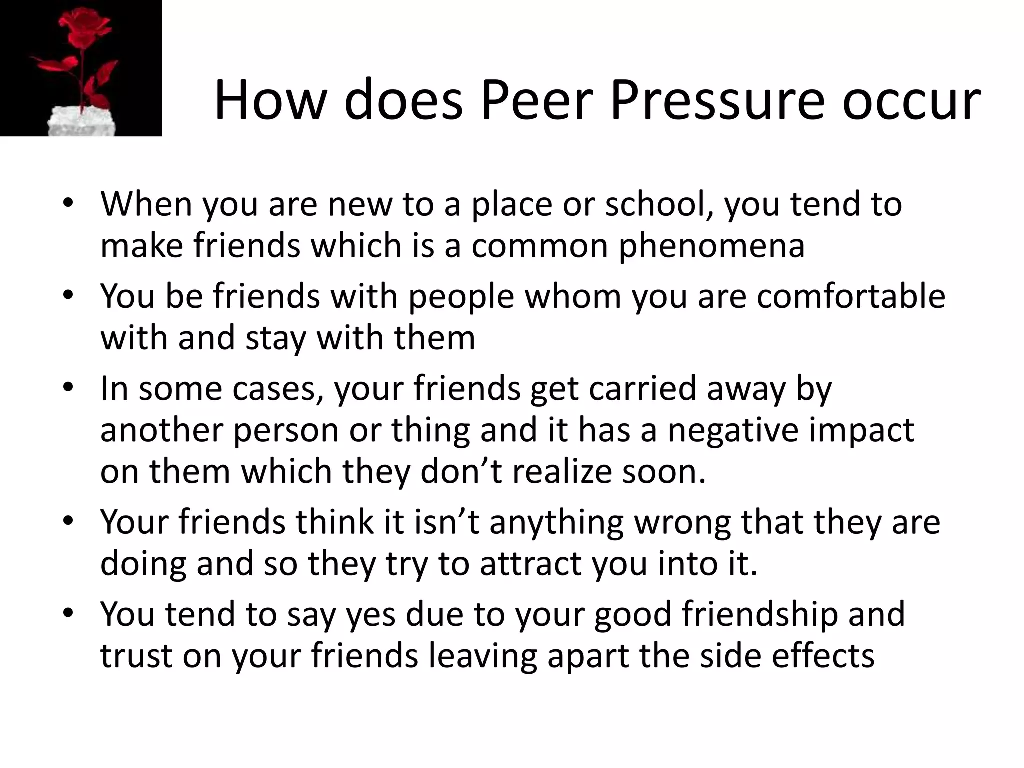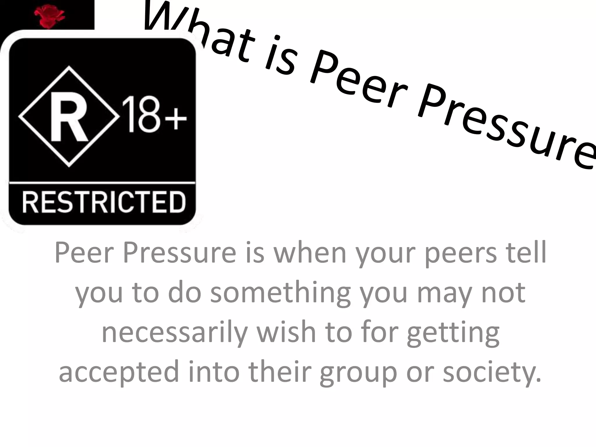 Peer pressure involves the influence of peers encouraging individuals to engage in activities they may not wish to do, often for social acceptance. While it can lead to negative outcomes like unhealthy habits, it occasionally may push individuals towards positive actions, though these instances are rare. Peer pressure primarily affects adolescents, particularly from ages 11 to 21, often leading to regrets in adulthood when individuals realize the consequences of their choices.