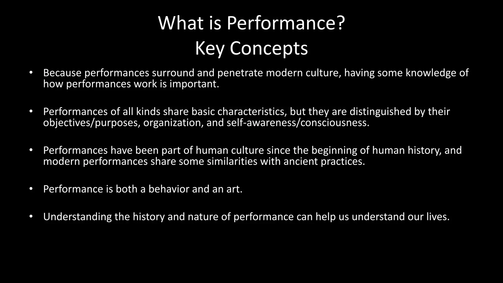 The document explores the concept of performance, covering its characteristics, objectives, and the distinctions between various types. It emphasizes the role of performance in culture, identity, and art, while discussing live versus mediated experiences and ritual elements. Key concepts include the shared characteristics of performance, performance studies, and the impact of theatrical practices on understanding human behavior and relationships.