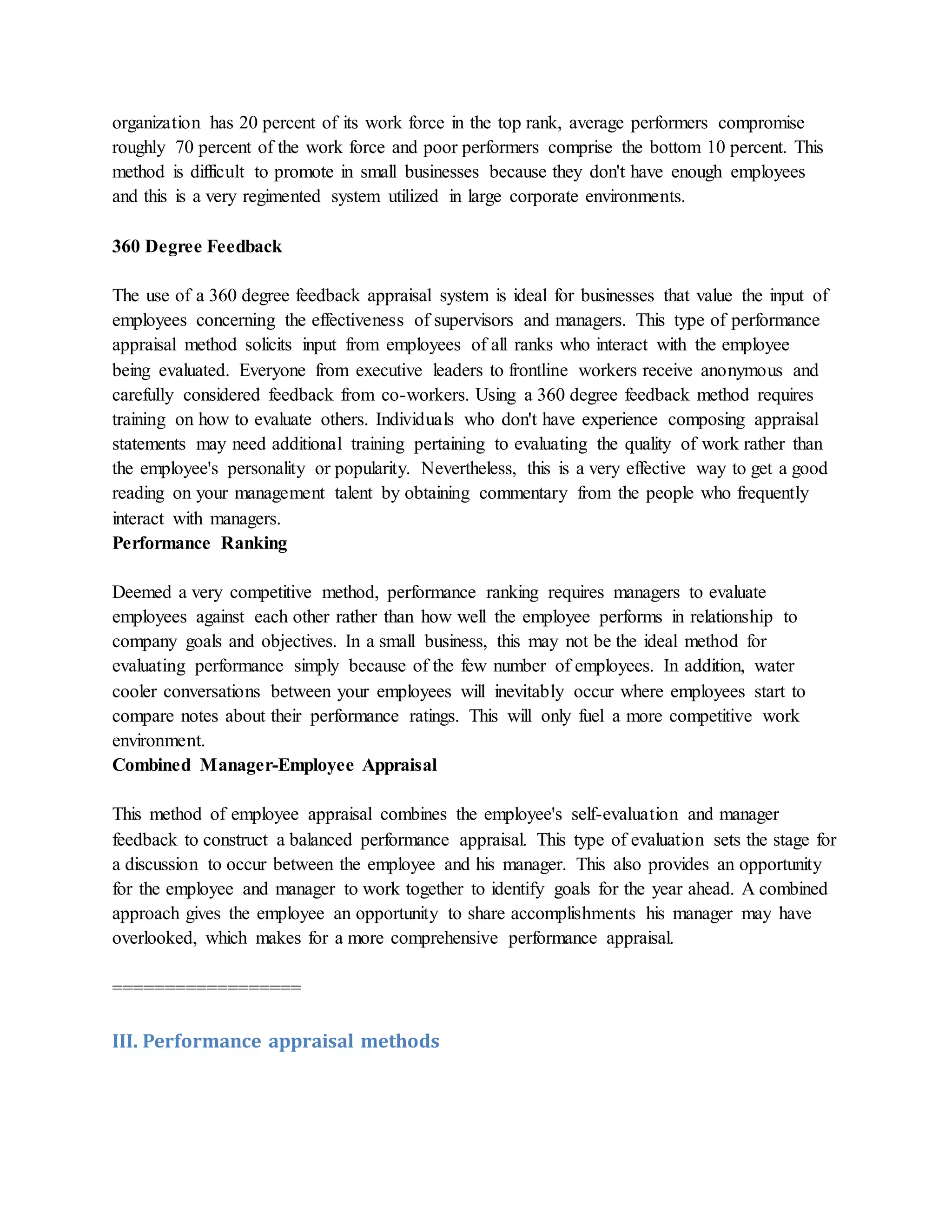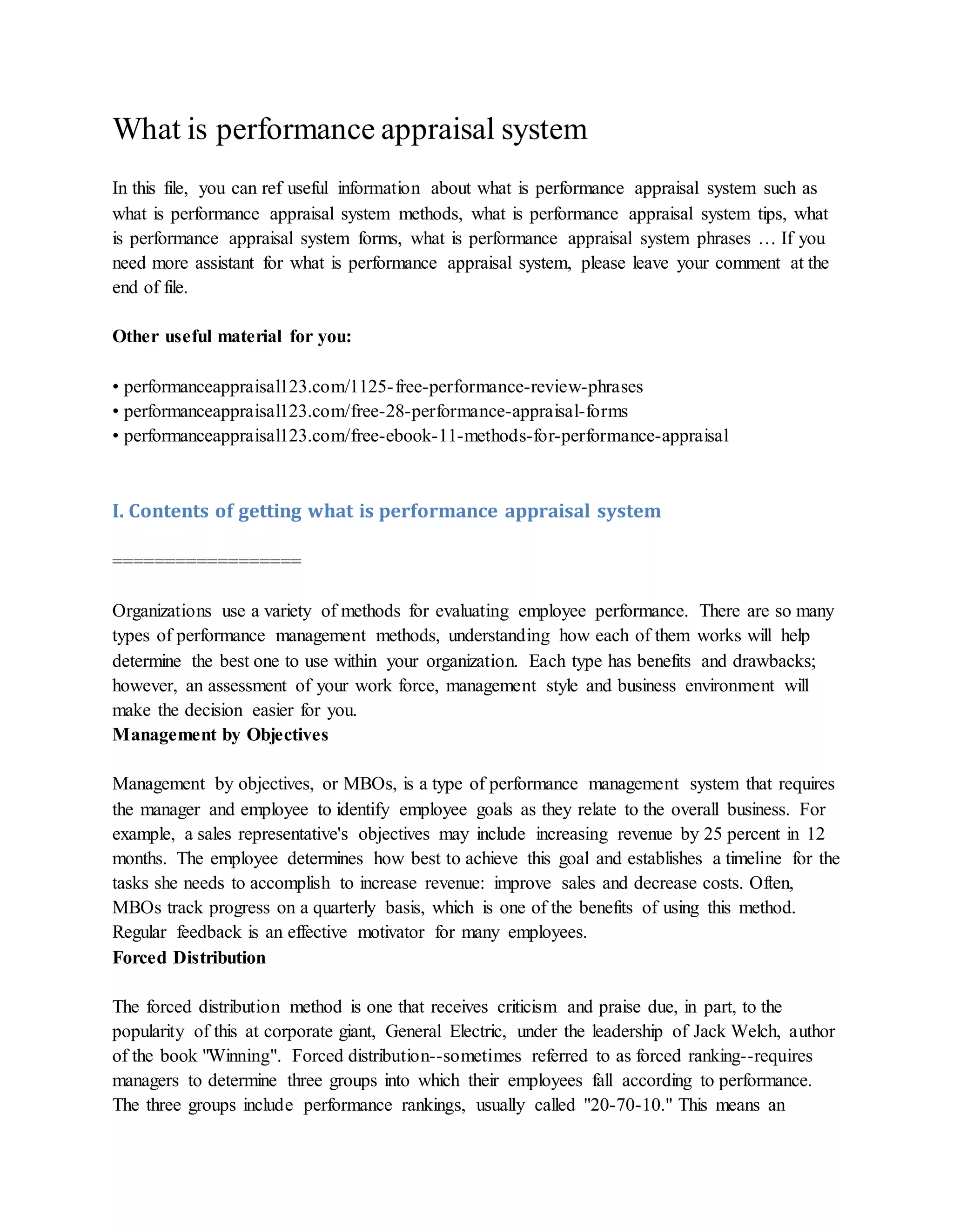 The document outlines various performance appraisal systems used by organizations to evaluate employee performance, such as Management by Objectives (MBO), Forced Distribution, and 360 Degree Feedback. Each method has unique benefits and drawbacks, and the choice of method should consider the organization's workforce and management style. Additionally, it provides tips and resources for further information on performance appraisal forms and phrases.