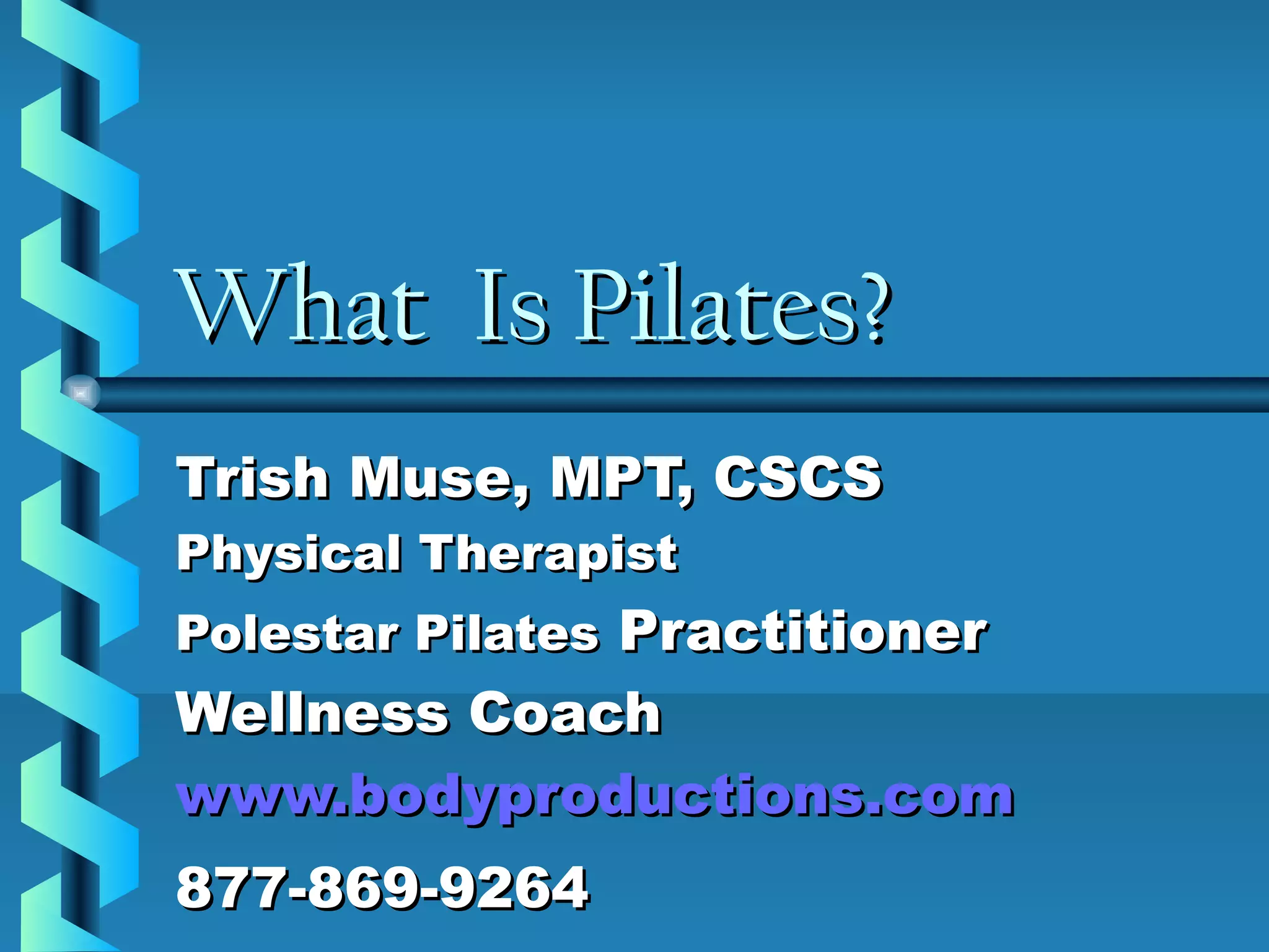 Pilates is a method of exercise developed by Joseph Pilates that uses specialized equipment and floor exercises to strengthen muscles, increase flexibility and focus the mind. The goal of Pilates is to train the body to work in its most natural state through precise movements and controlled breathing. Some key benefits of Pilates include improved posture, balance, and coordination as well as reduced stress and increased body awareness.