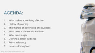 The document provides an overview of advertising planning. It discusses the history and origins of planning in the UK and US in the 1960s and 1970s. The role of the planner is to represent the consumer perspective within the advertising triangle between the agency, client, and consumer. Planners conduct research to develop insights about consumers and use those insights to inform strategic thinking, brief creatives, and ensure advertising output stays relevant and on-strategy. They guide the creative process and remain engaged throughout the campaign lifecycle.