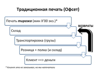 Документ обсуждает различия между традиционной печатью и печатью по требованию (ППТ) для авторов книг. ППТ предлагает быструю доступность, отсутствие складских затрат и возможность немедленного редактирования текста, в отличие от традиционной печати, которая требует больших тиражей и имеет более длительные сроки доставки. В документе также упоминаются финансовые аспекты и преимущества обратной связи с читателями.