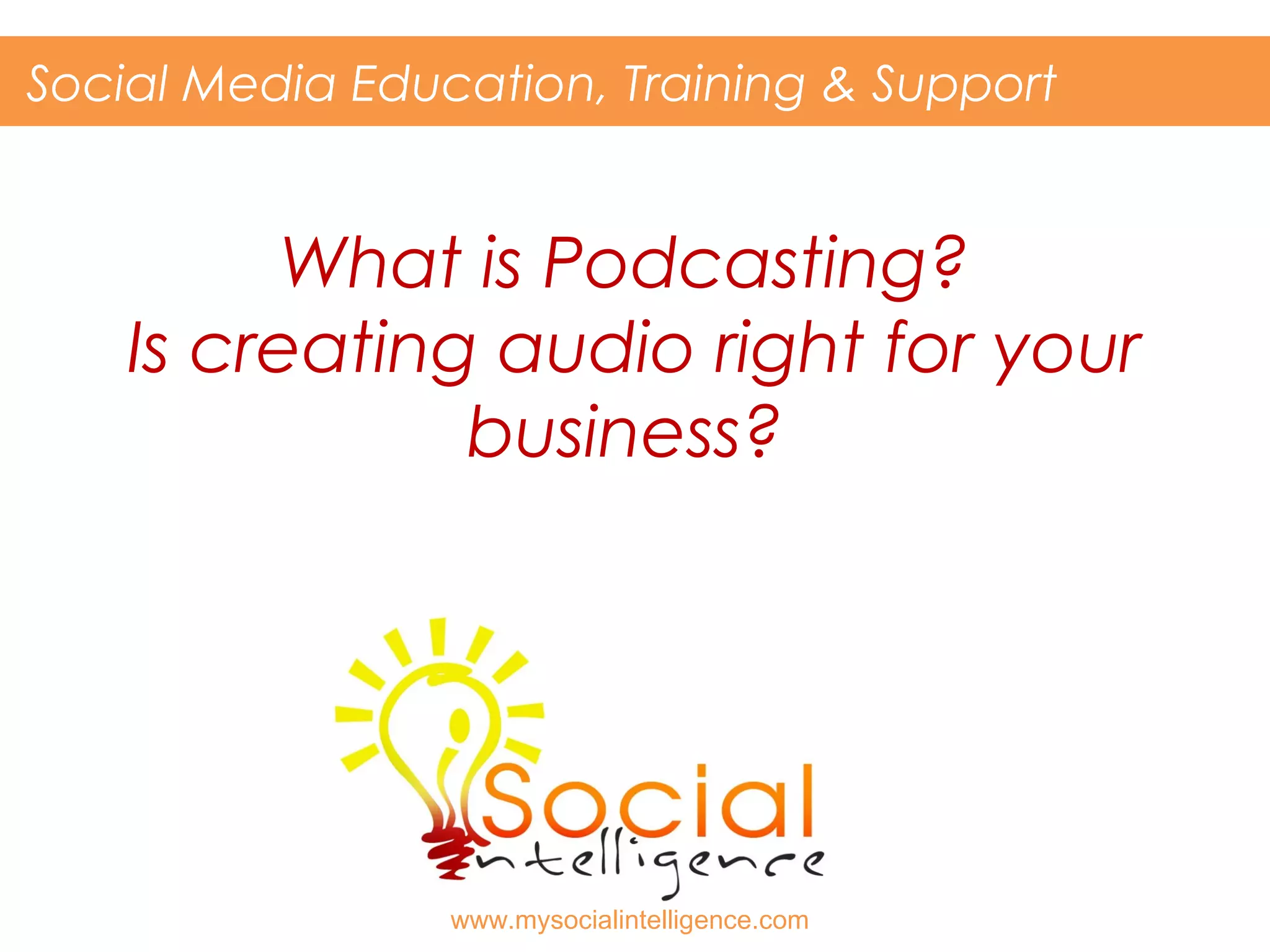 The document discusses podcasting and provides advice for businesses considering creating podcasts. It defines a podcast as an audio file, like an MP3, that can be listened to on devices like MP3 players, smartphones, tablets, and computers. It notes that the process of creating a podcast will depend on the technology and distribution method used. The document recommends that businesses focus on creating targeted, meaningful content between 20-60 minutes long and use podcasts to drive inquiries, increase email lists, complement blogging strategy, and educate audiences. It concludes by introducing the agency that created the resource and how to contact them.